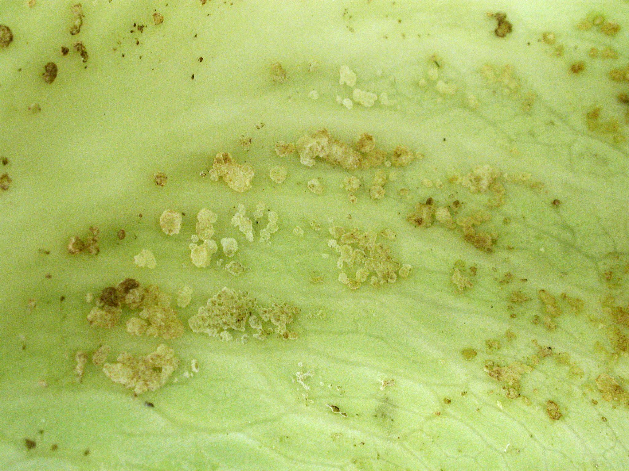 Une vue rapprochée de la face supérieure d’une feuille de chou pommé (cv 'Amtrack') qui présente plusieurs protubérances blanches à beiges, d’aspect liégeux, et localisées principalement entre les nervures. Les feuilles enveloppantes sont les plus affectées. Le même symptôme est présent à la face supérieure. Aucun agent pathogène n’a été détecté des dommages. Quelques thrips de l'oignon (Thrips tabaci) ont été observés, mais en quantité insuffisante pour expliquer les dommages. Le résultat des tests de laboratoire, la nature des dommages et la forte proportion de plants affectés au champ (90 %) confirment la présence d'œdème sur la feuille.