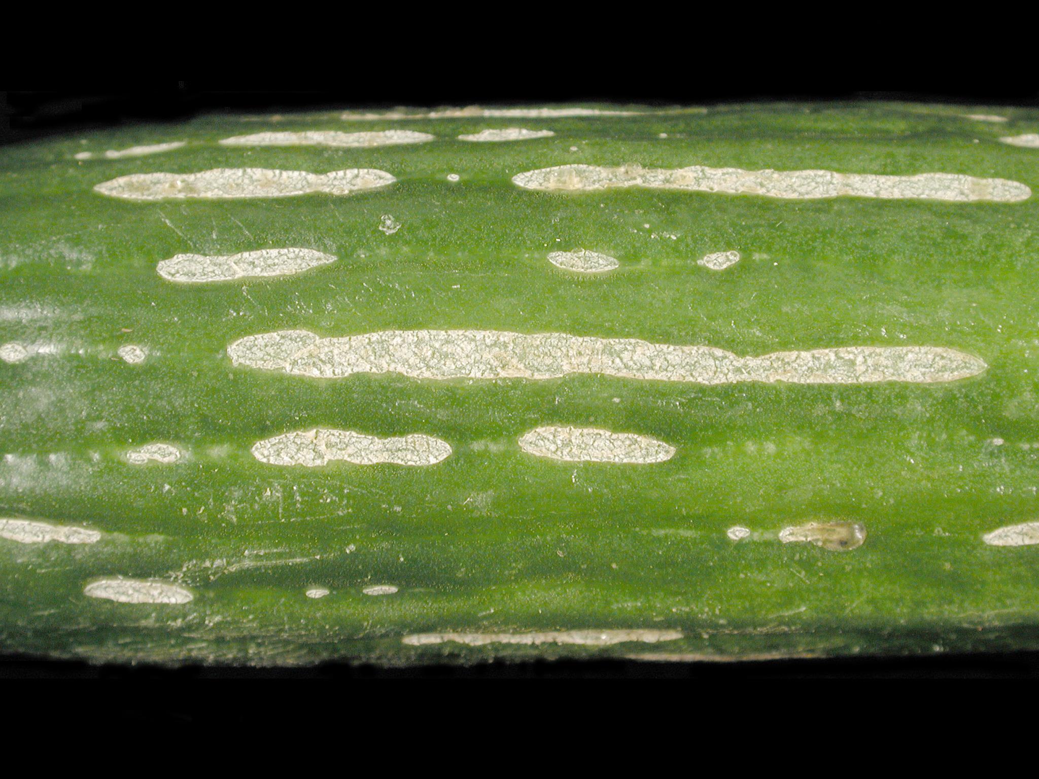 Présence de longues stries subérisées grisâtres à brunâtres disposées longitudinalement tout autour du concombre. Ces lésions peuvent être très courtes soit de quelques millimètres ou atteindre plusieurs centimètres de longueur. L'épiderme environnant les dommages est vert pâle. La chair est sans symptôme (non visible ici). Considérant le type de dommage, le fort pourcentage de plants atteints (80 à 100 %), l'absence de thrips et de dommages aux feuilles et les écarts de température importants survenus dans la serre, il s'agit probablement de la gerçure.
