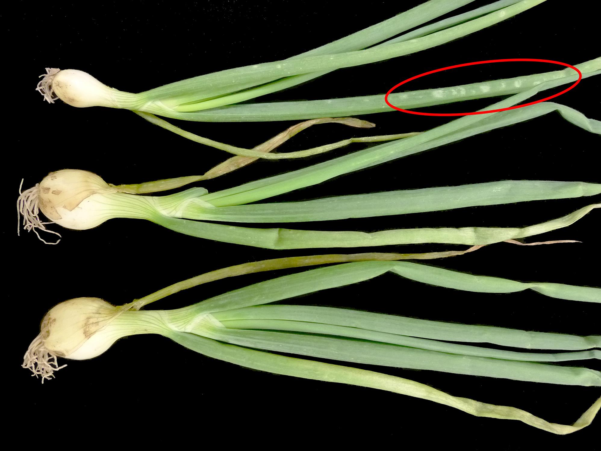 Sur le plant en haut de l’image, présence de taches blanchâtres (voir cercle), au contour irrégulier, localisées sur un seul côté de quelques feuilles. Notez que les symptômes sont moins bien définis sur les deux autres plants. Les tests de laboratoire se sont avérés négatifs pour la détection de bactérie, champignon et virus. Les renseignements transmis par la conseillère agricole mentionnent la présence de fortes pluies accompagnées de vents violents avant l’apparition des symptômes. En se basant sur le caractère non évolutif des symptômes, sur les événements climatiques et la distribution généralisée du problème au champ, les symptômes foliaires seraient la conséquence de blessures causées par de la pluie forte poussée par des vents violents.