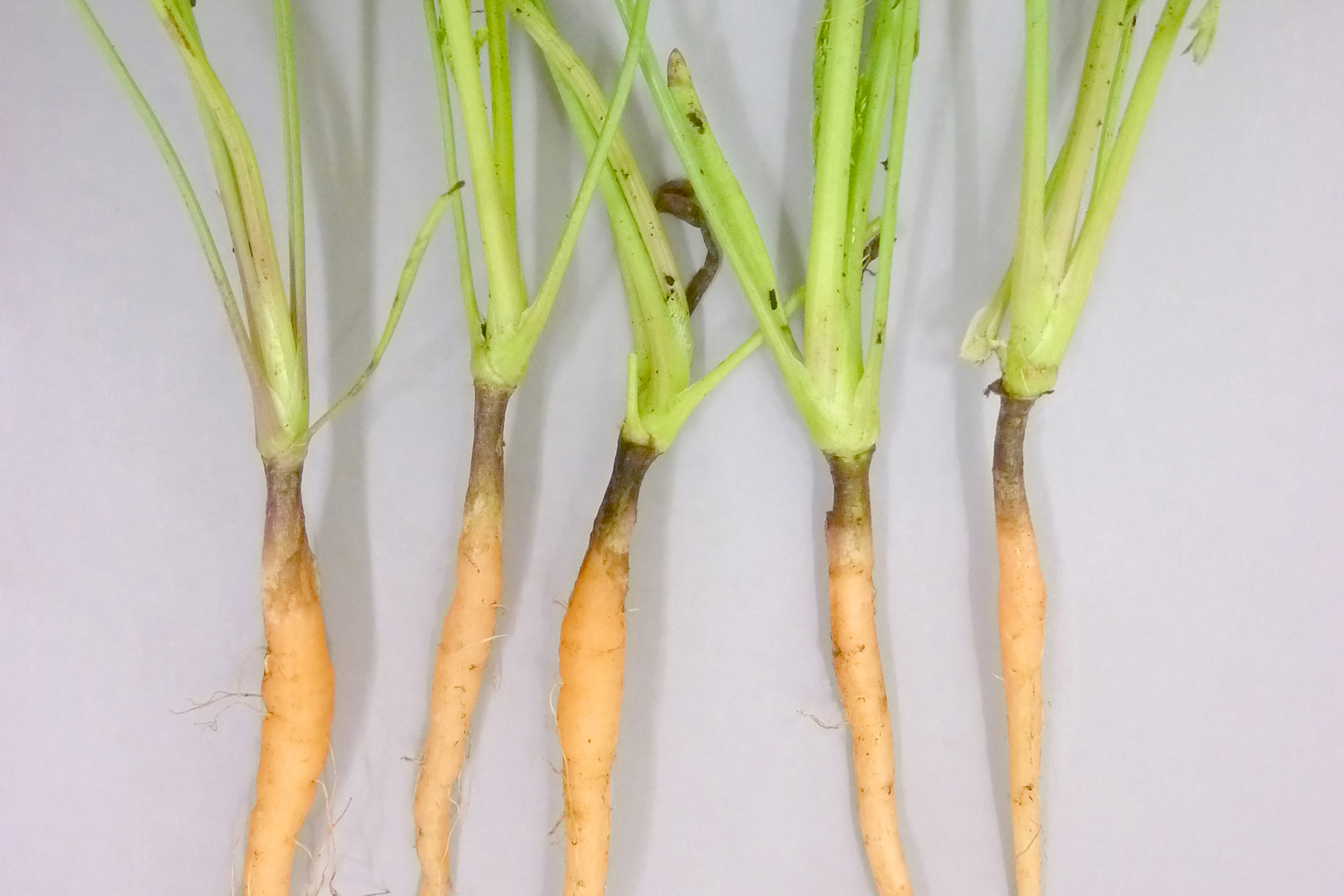 Sur de jeunes plants de carottes (cv 'Endy') cultivés au champ, présence d’une constriction brunâtre, liégeuse et superficielle au collet. Les feuilles jaunissent, brunissent ou dépérissent sur les plants. La racine est sans symptôme. Ce symptôme est typique d’un chancre de chaleur causé par des températures élevées à la surface du sol. Les plants affectés (10 %) sont cultivés en terre noire et distribués en foyer, au centre du champ. Il y avait probablement des îlots de chaleur à cet endroit.