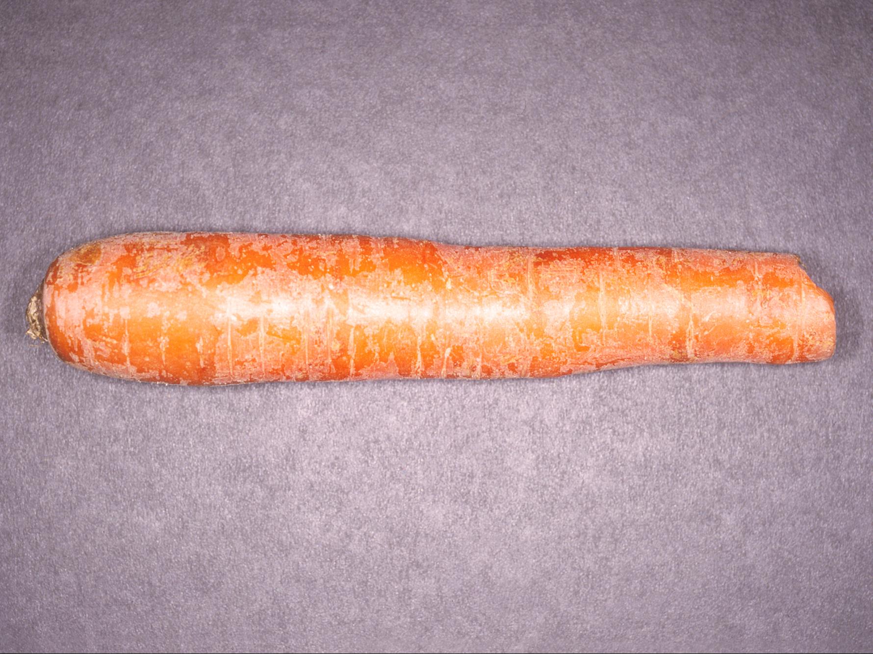 Sur une carotte provenant d’un entrepôt, décollement d’une fine pellicule blanchâtre à grisâtre de l’épiderme de la racine. Ces dommages sont causés par une humidité relative trop basse lors d’un entreposage prolongé. Ce phénomène est connu comme la desquamation chez la carotte.