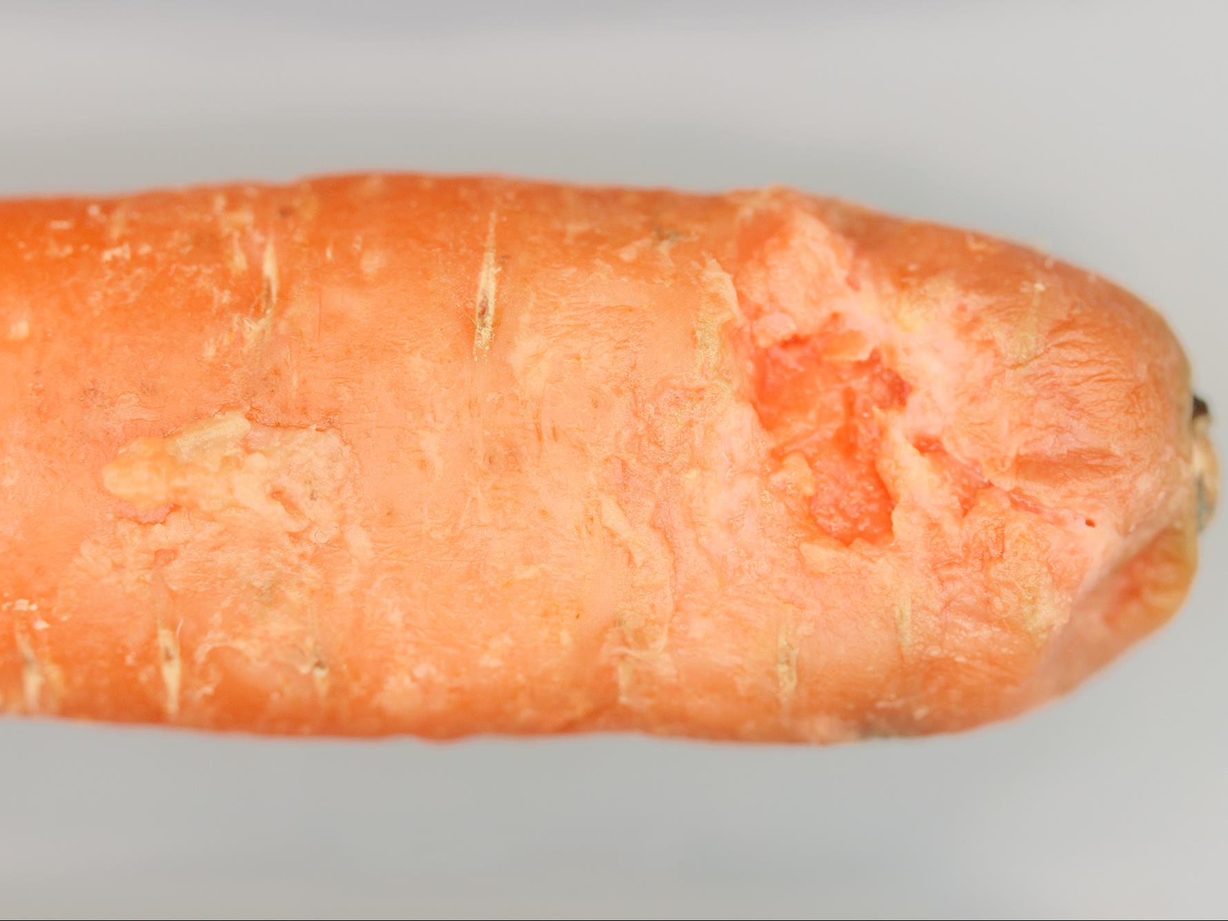 Une vue rapprochée de l’épiderme d’une carotte provenant d’un entrepôt présente des zones de pourriture molle qui progresse dans la racine. Les tissus se désagrègent dans ces zones. Les tests de laboratoire ont révélé la présence de bactéries secondaires et des levures. Les bactéries secondaires n’ont pas la capacité de pénétrer directement les tissus végétaux sains, car elles ne sont pas pectinolytiques, mais peuvent dégrader des tissus déjà endommagés. Quant aux levures, elles sont rapportées pour causer des pourritures d’entreposage chez la carotte. Leur développement est favorisé par des conditions chaudes et humides. Des pourritures liées aux levures apparaissent généralement lorsque les conditions d’entreposage sont inadéquates en matière de température et de ventilation.