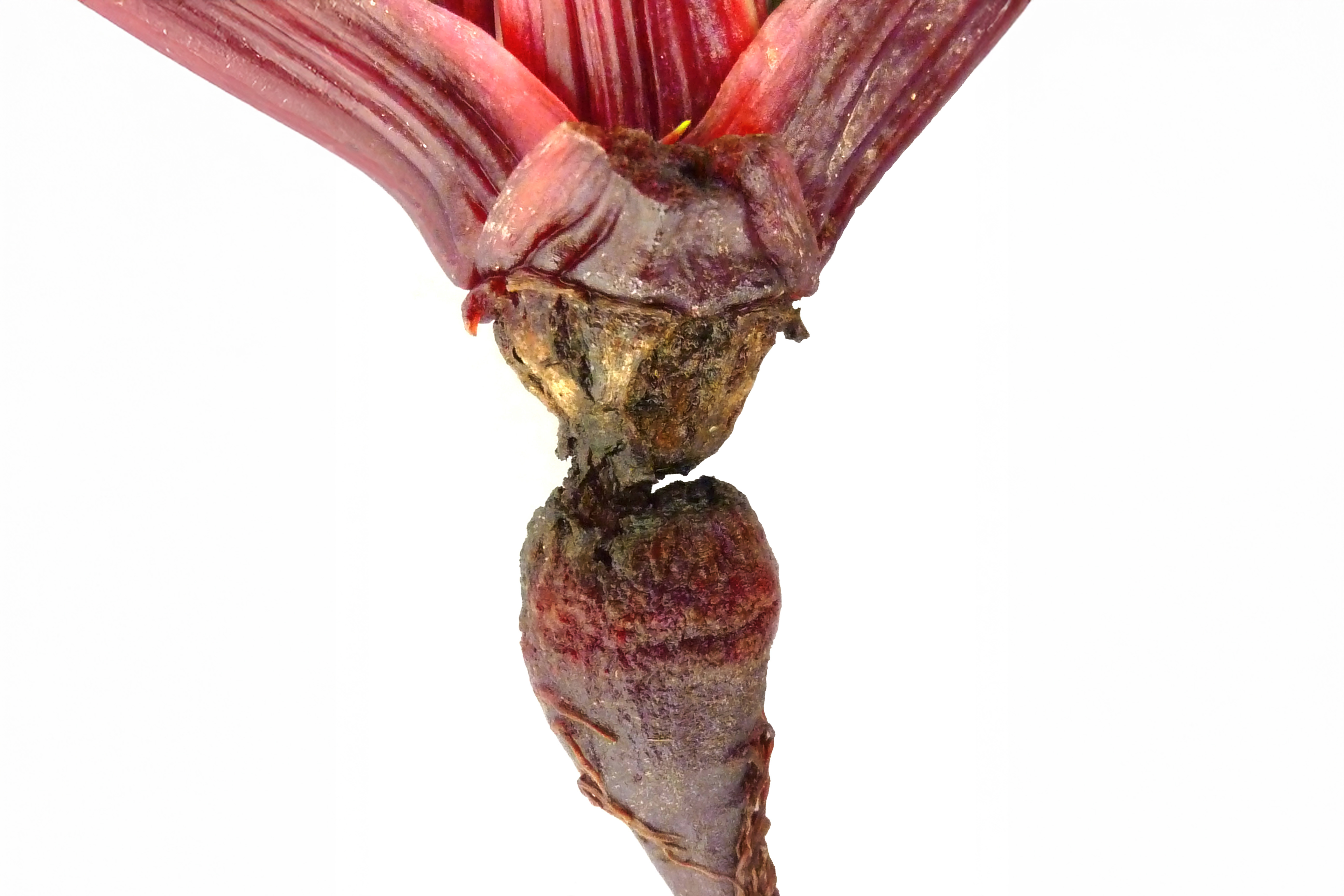 Sur une betterave potagère (cv 'Red Ace'), présence d’une sévère constriction brunâtre et liégeuse au collet. La racine est presque complètement détachée du collet. La racine est sans symptôme. Ce symptôme est typique d’un chancre de chaleur causé par des températures élevées à la surface du sol. Au champ, les plants affectés étaient cultivés en terre minérale et distribués en foyer, sur buttes. Il y avait probablement des îlots de chaleur à ces endroits.