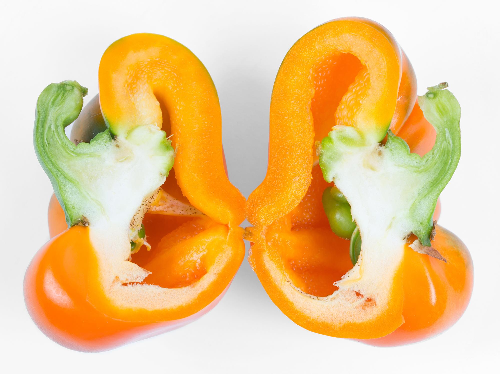 Les poivrons (cv 'Magno') sont de petite taille, aplatis et portent peu de graines. Chez le poivron, les fruits difformes sont caractéristiques de grands écarts de température entre le jour et la nuit lors de la floraison, ce qui entraîne une pollinisation inadéquate. Dans ce cas, il est fort probable que les écarts de température soient liés au froid.