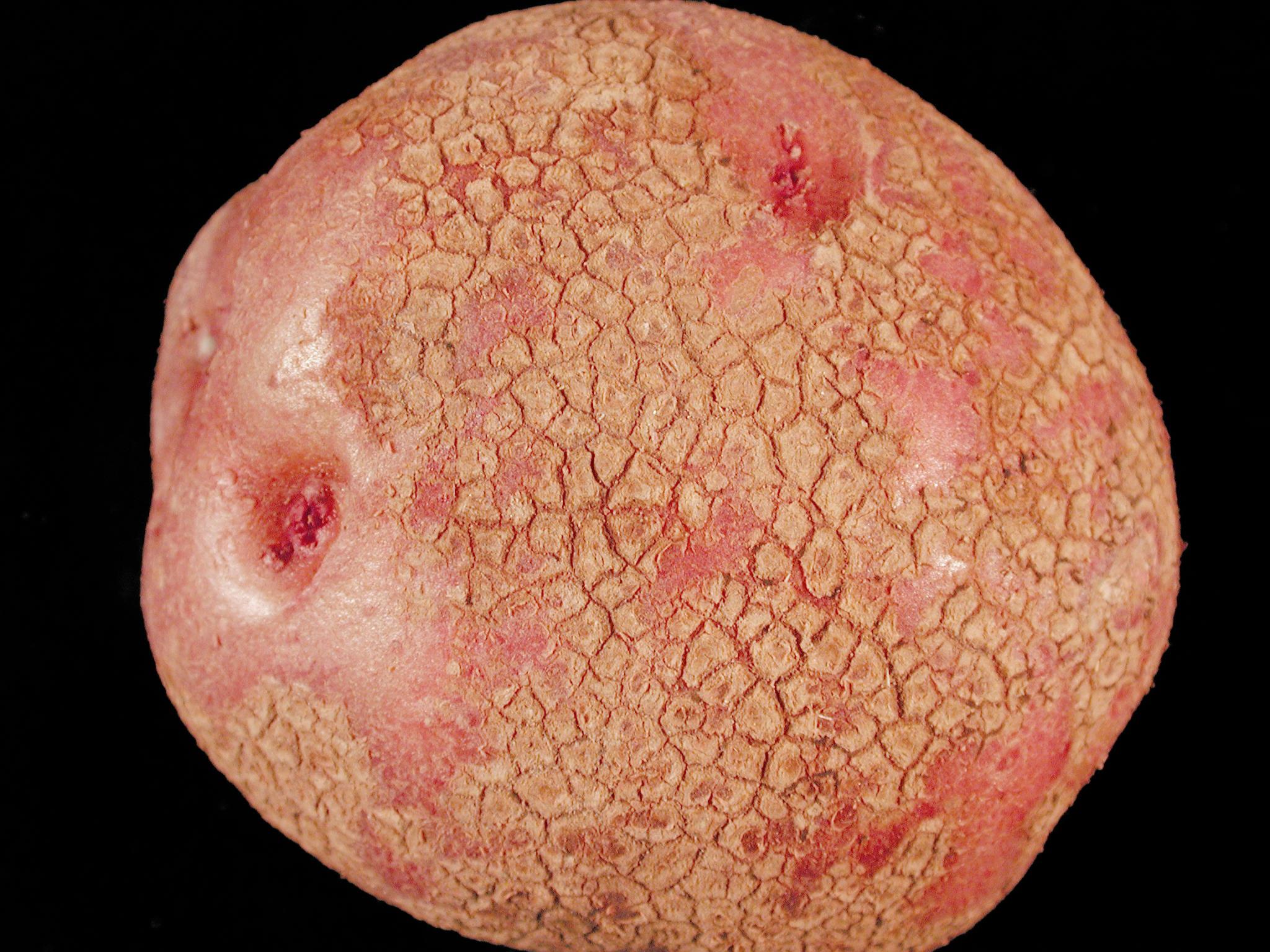 Sur un tubercule de pomme de terre provenant d’un entrepôt, présence de nombreuses crevasses brunes et rugueuses, à contour très angulaire, couvrant la plus grande partie de la surface du périderme. La chair est saine. Ce symptôme est caractéristique de la peau d’éléphant ou d’alligator chez la pomme de terre. Notez que du mycélium de Rhizoctonia solani (rhizoctonie) a été détecté des crevasses, mais ce champignon ne cause pas de dommages aussi réguliers et profonds que ceux observés sur ces tubercules.