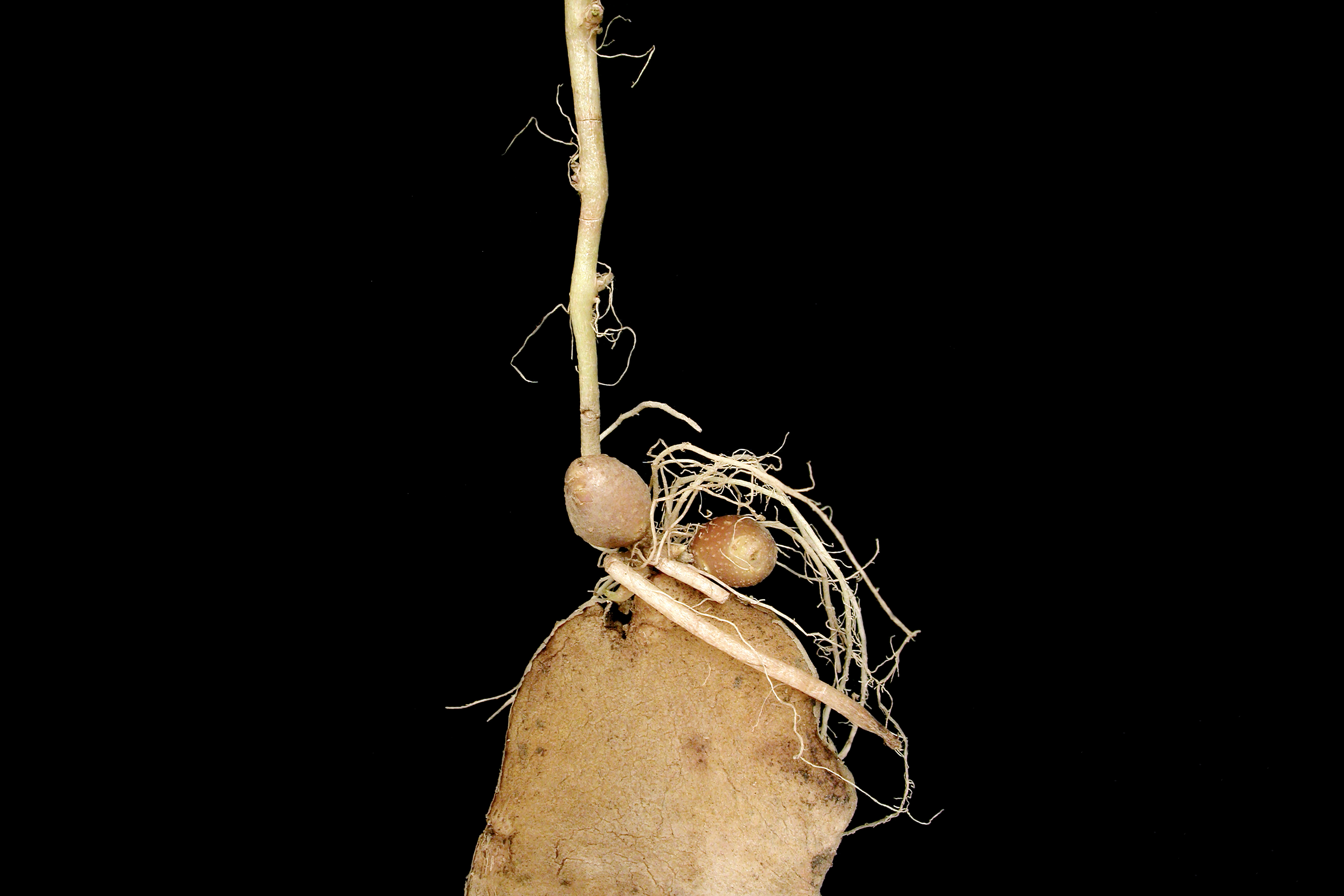 Une vue rapprochée d’un plant de pomme de terre (cv 'Goldrush') montre la production de petits tubercules groupés en couronne au-dessus de la semence. Ce plant est faiblement développé (20 cm de hauteur, petites feuilles, radicelles fines et rares) pour la période de l’année (mi-juillet). Ce désordre physiologique est lié à une croissance secondaire appelée boulage chez la pomme de terre.