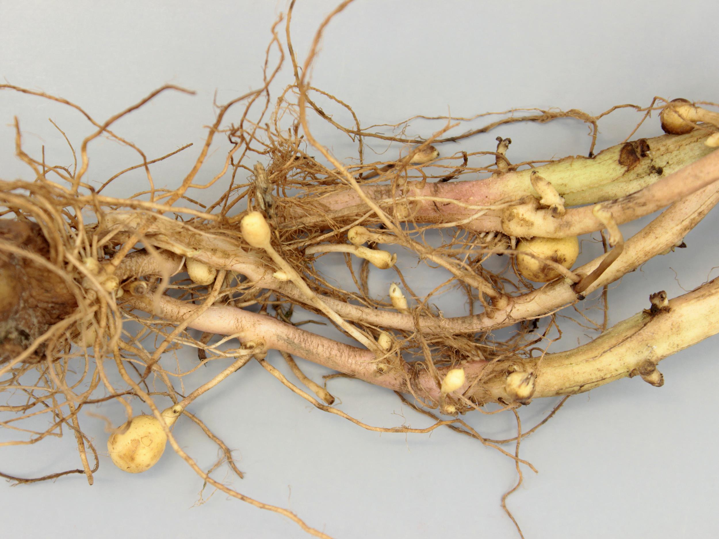 Un plant de pomme de terre montre la production de plusieurs petits tubercules à l’extrémité d’un court stolon. Les tubercules sont concentrés dans la région du collet. Ce désordre physiologique est lié à une croissance secondaire appelée boulage chez la pomme de terre.