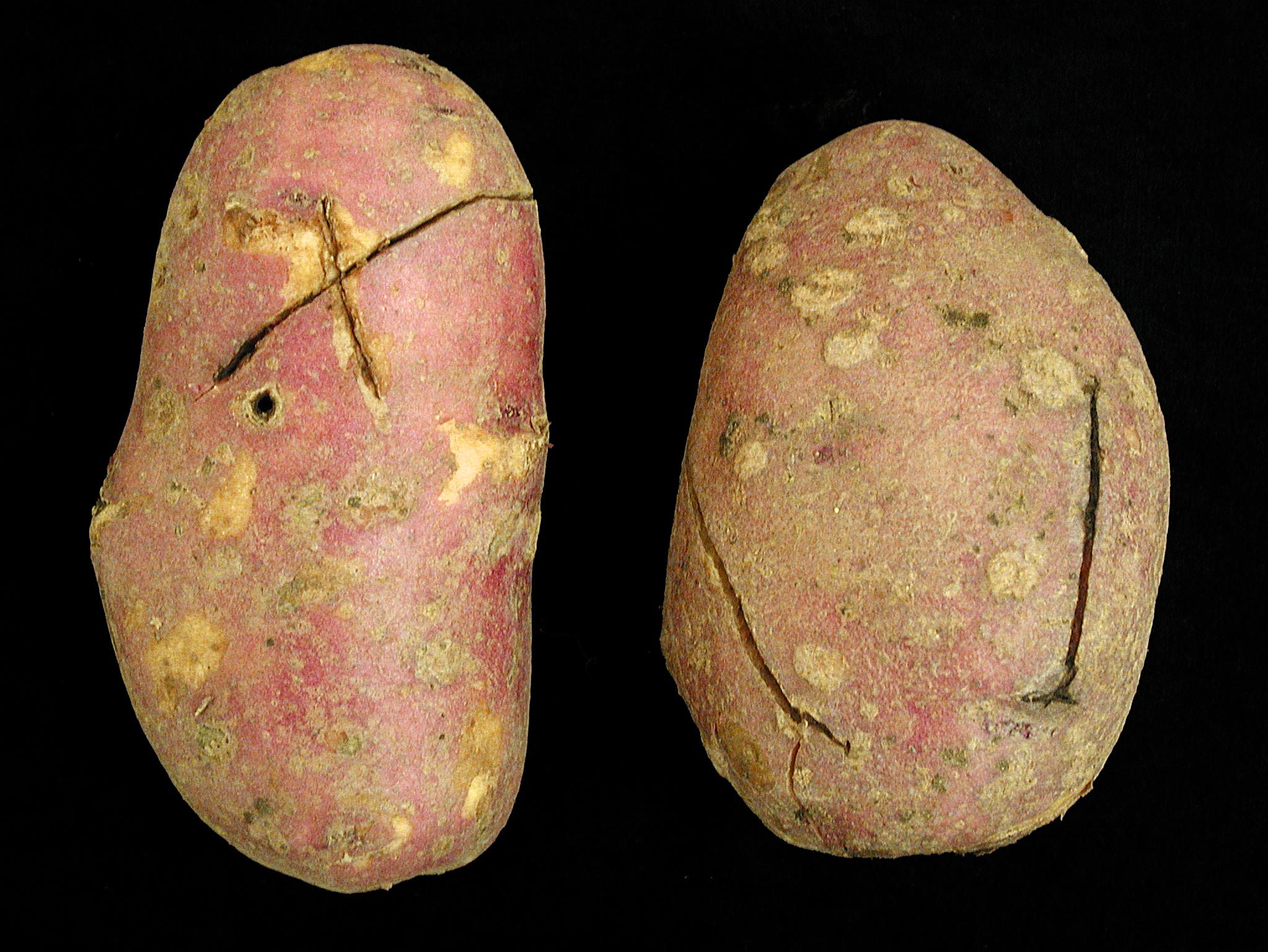 Des tubercules de pomme de terre (cv 'Bijou rouge') provenant d’un champ montrent quelques fentes de différentes longueurs et profondeurs sur le périderme. Les fentes sont très nettes et ne sont pas cicatrisées. Ces malformations sont apparues lors de la récolte et sont connues comme des blessures mécaniques liées aux opérations de récolte, aux conditions climatiques et à l’état des tubercules (turgescence, maturité).