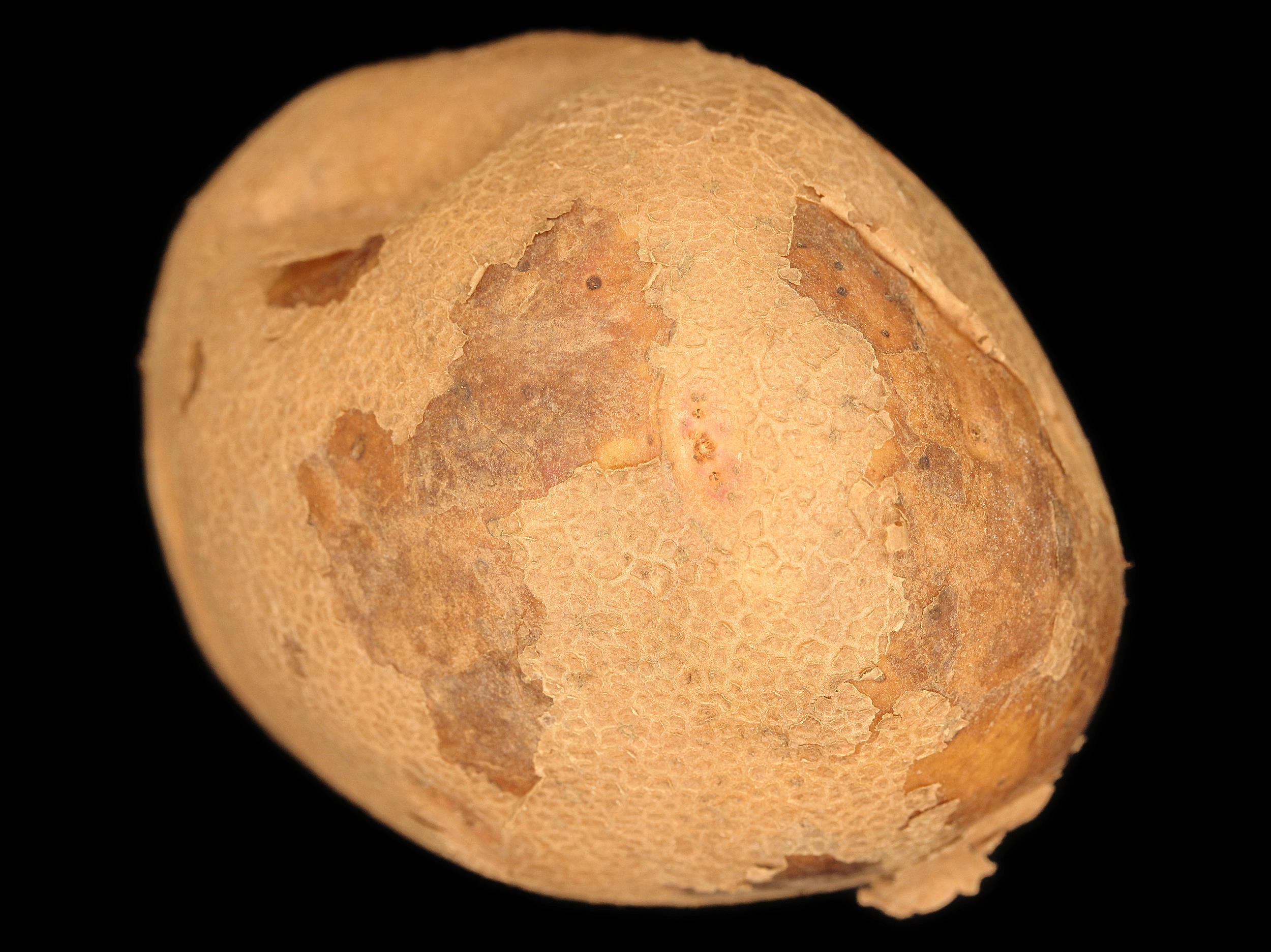 Un tubercule de pomme de terre provenant d’un champ montre de fines pelures qui se détachent en grandes plaques de quelques centimètres dans la région de la couronne. Les tissus deviennent bruns peu de temps après le pelage. La zone limitrophe des dommages est bien nette. Sous les dommages, la chair et les vaisseaux conducteurs du talon sont intacts (non visible ici). Ce symptôme est caractéristique du pelage et se manifeste à la récolte sur des tubercules immatures dont le périderme n’est pas complètement subérisé.