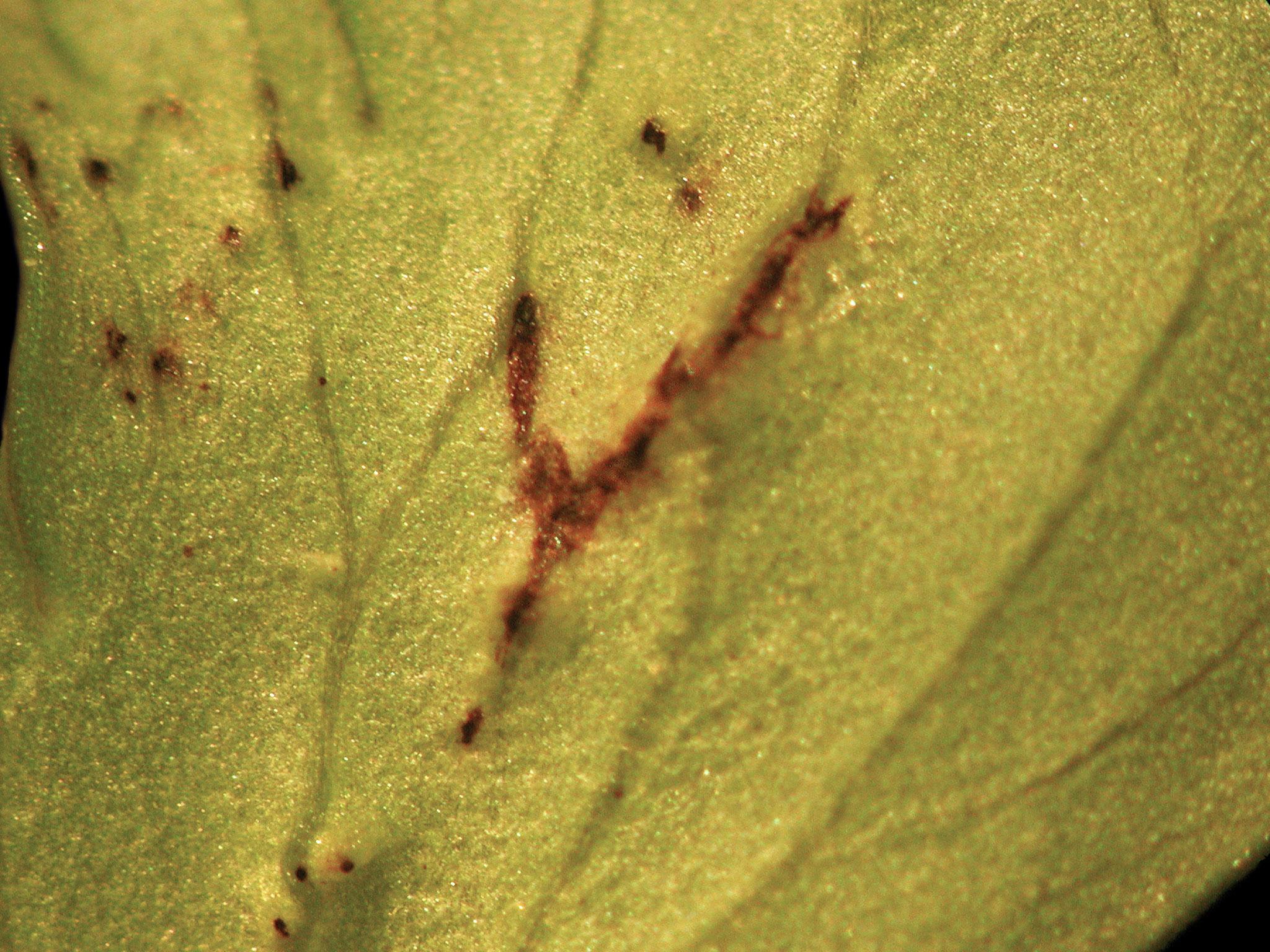 Une vue rapprochée d’une feuille de trolle de Chine (cv 'Golden Queen') cultivée en serre montre les minuscules taches ou ponctuations circulaires, surélevées, rougeâtres à brunâtres. Le diamètre des taches est inférieur à 1 mm. Elles sont réparties au hasard sur le limbe et les feuilles affectées comptent de nombreuses taches. Les symptômes sont présents à la face supérieure et inférieure. Les tests de laboratoire se sont avérés négatifs pour la détection de phytoplasme. Par contre, le pH du substrat est élevé (7,1) ce qui peut rendre le bore moins disponible pour la plante. La conseillère mentionne que les symptômes n’ont pas évolué depuis l’envoi de l’échantillon, ce qui signifie que le problème n’est pas de nature infectieuse. Il est possible de croire que les symptômes soient causés par un pH inadéquat du substrat qui a rendu le bore moins disponible pour la plante.