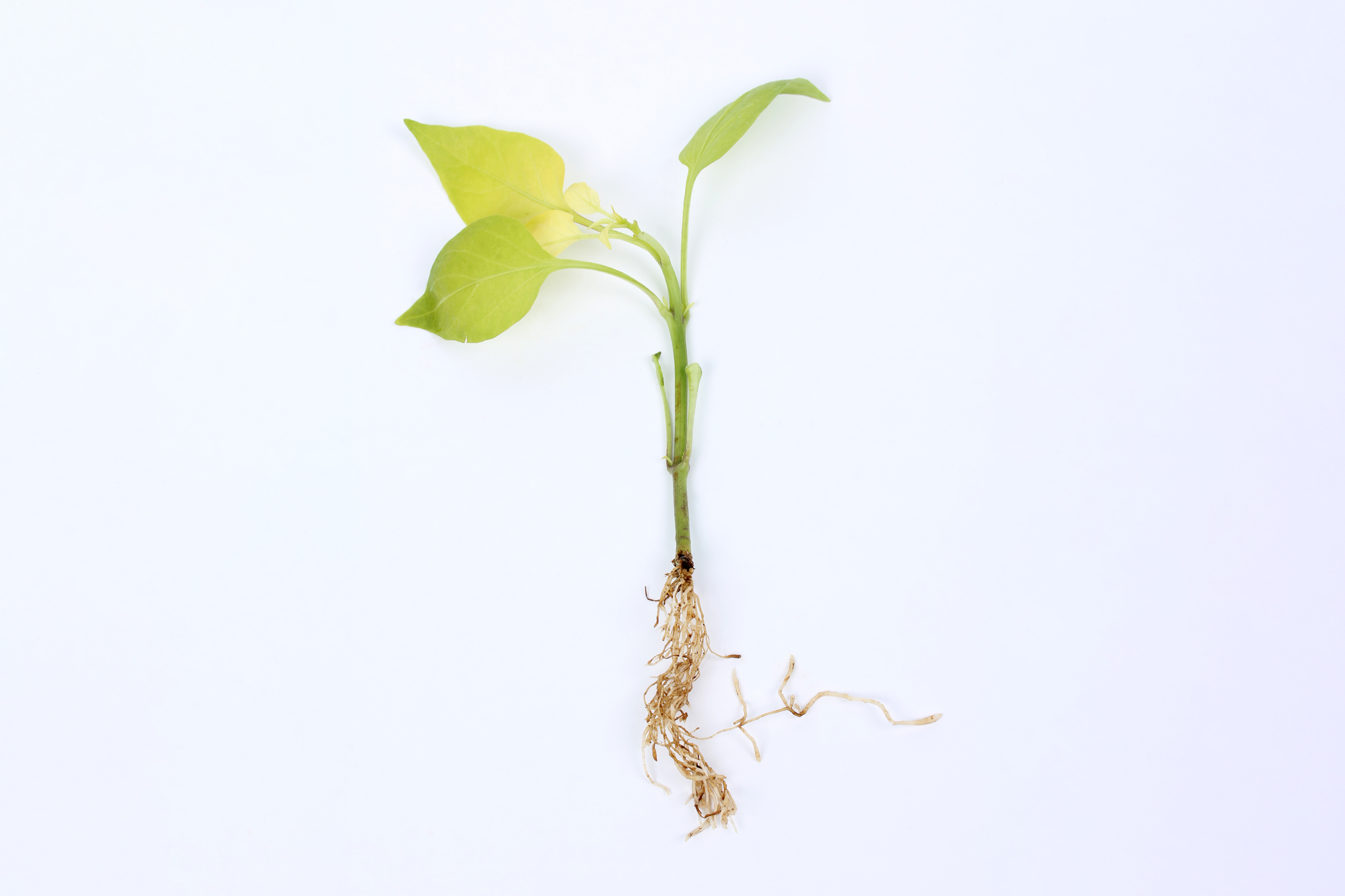 Sur un jeune plant de poivron (stade 5 feuilles), les feuilles terminales et médianes présentent un jaunissement prononcé. Le jaunissement débute à la base du limbe et affecte même les nervures. Les jeunes feuilles sont les plus affectées. L’extrémité de certaines racines est brune. Aucun virus ni champignon racinaire n’a été détecté. Le pH (6,6) et la conductivité électrique (8,1 mS/cm) du substrat sont trop élevés. Comme 95 % de la production est atteinte, il s'agit probablement d'un problème non parasitaire. Les symptômes foliaires s’apparentent à ceux d’une carence en fer.