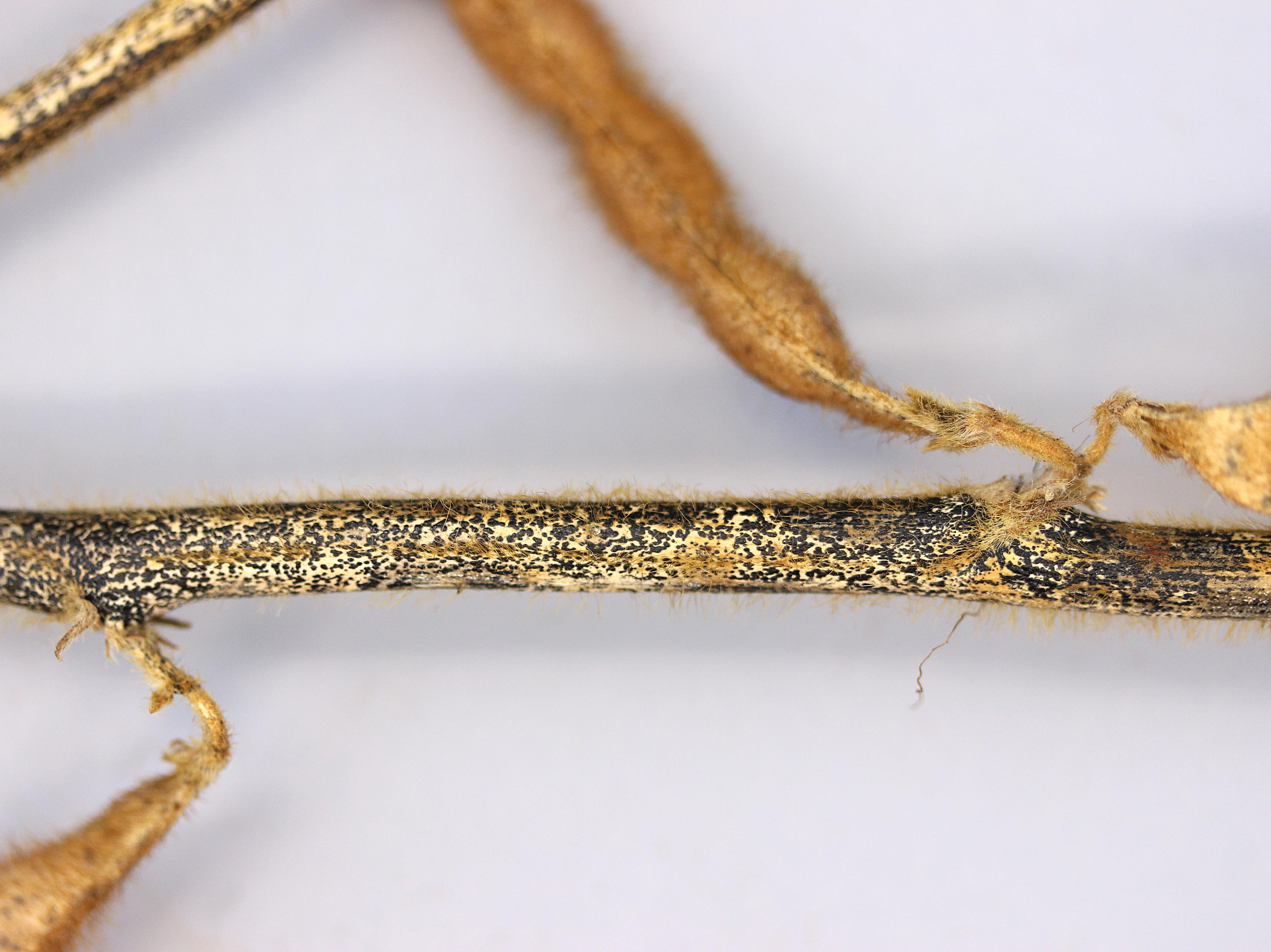 Sur la tige principale et les rameaux d’un plant de soya, présence de petits chancres couverts de nombreuses pycnides noires alignées ou en petits ilots. Les observations microscopiques ont révélé la présence du champignon Phomopsis sp., responsable de la brûlure phomopsienne chez le soya. Il s’agit probablement de Phomopsis phaseoli.