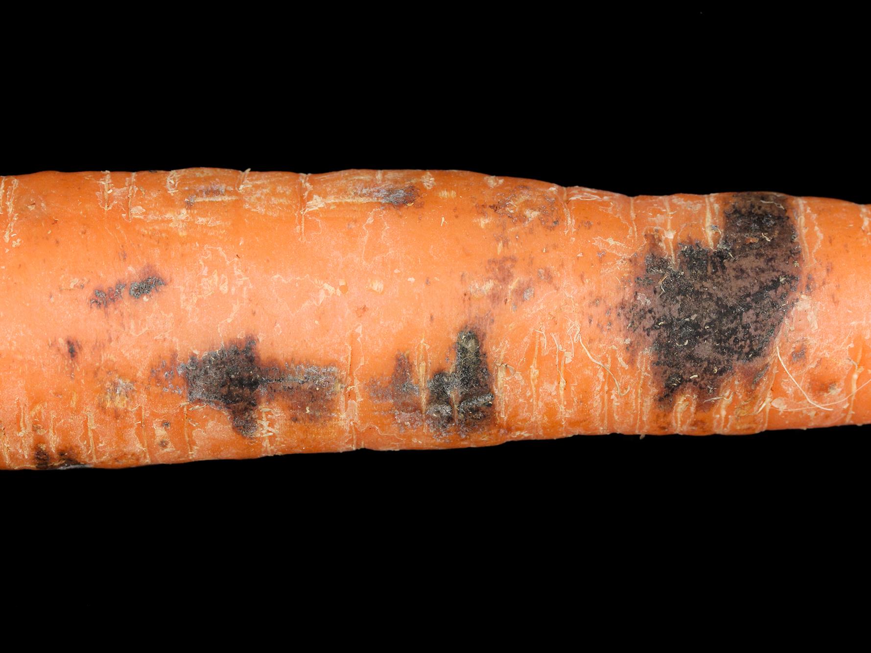 Sur l’épiderme d'une carotte provenant d’un champ, présence de lésions noires, superficielles et irrégulières. Les observations microscopiques ont révélé la présence de chlamydospores du champignon Berkeleyomyces basicola (syn. Thielaviopsis basicola), responsable de la pourriture noire des racines.