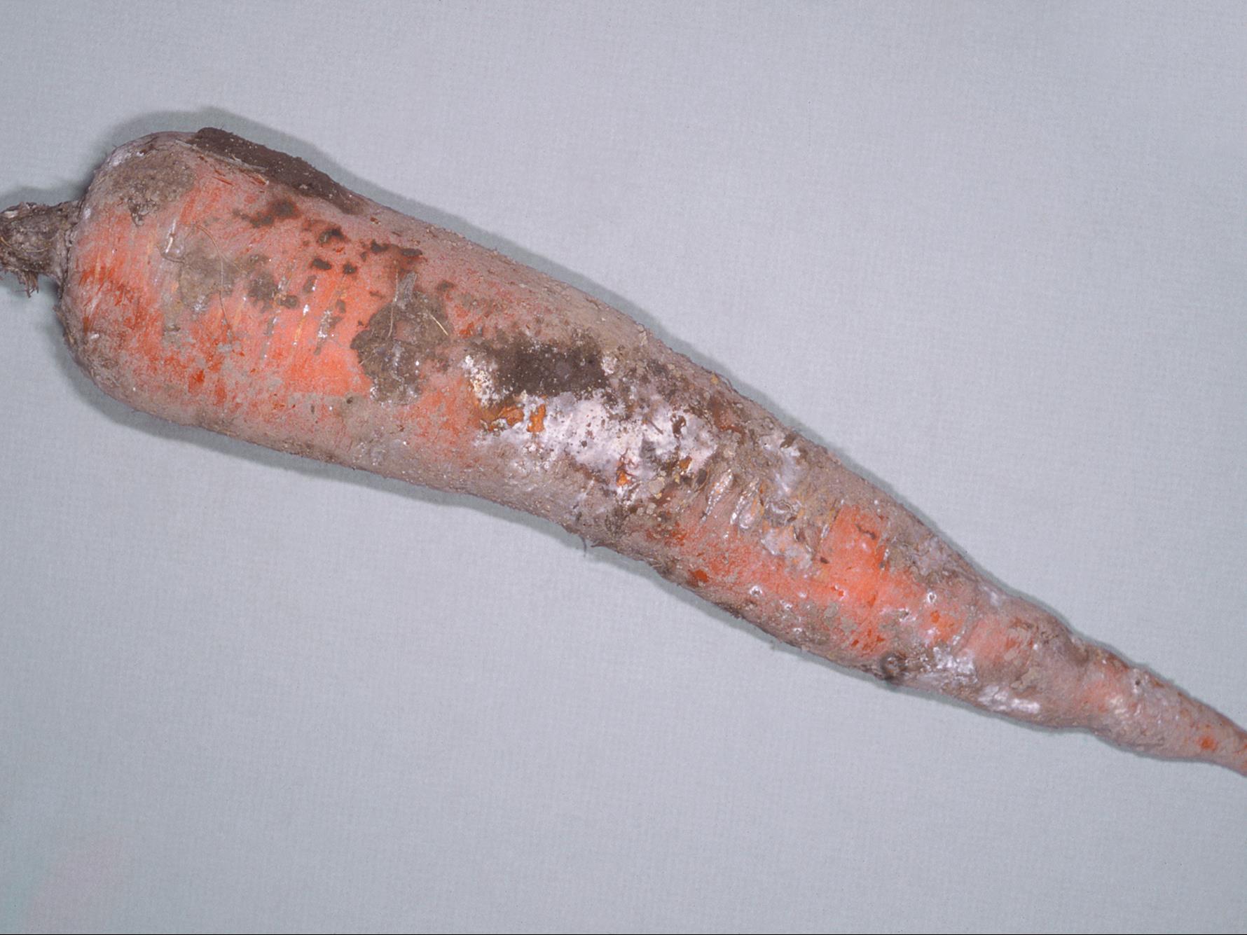 Sur une carotte non lavée provenant d’un entrepôt, présence d’une grande tache ou plage irrégulière, colonisée par un mycélium blanchâtre cotonneux. Le mycélium colonise également certaines lenticelles. Les observations microscopiques ont révélé la présence du champignon Rhizoctonia carotae, responsable du rhizoctone.