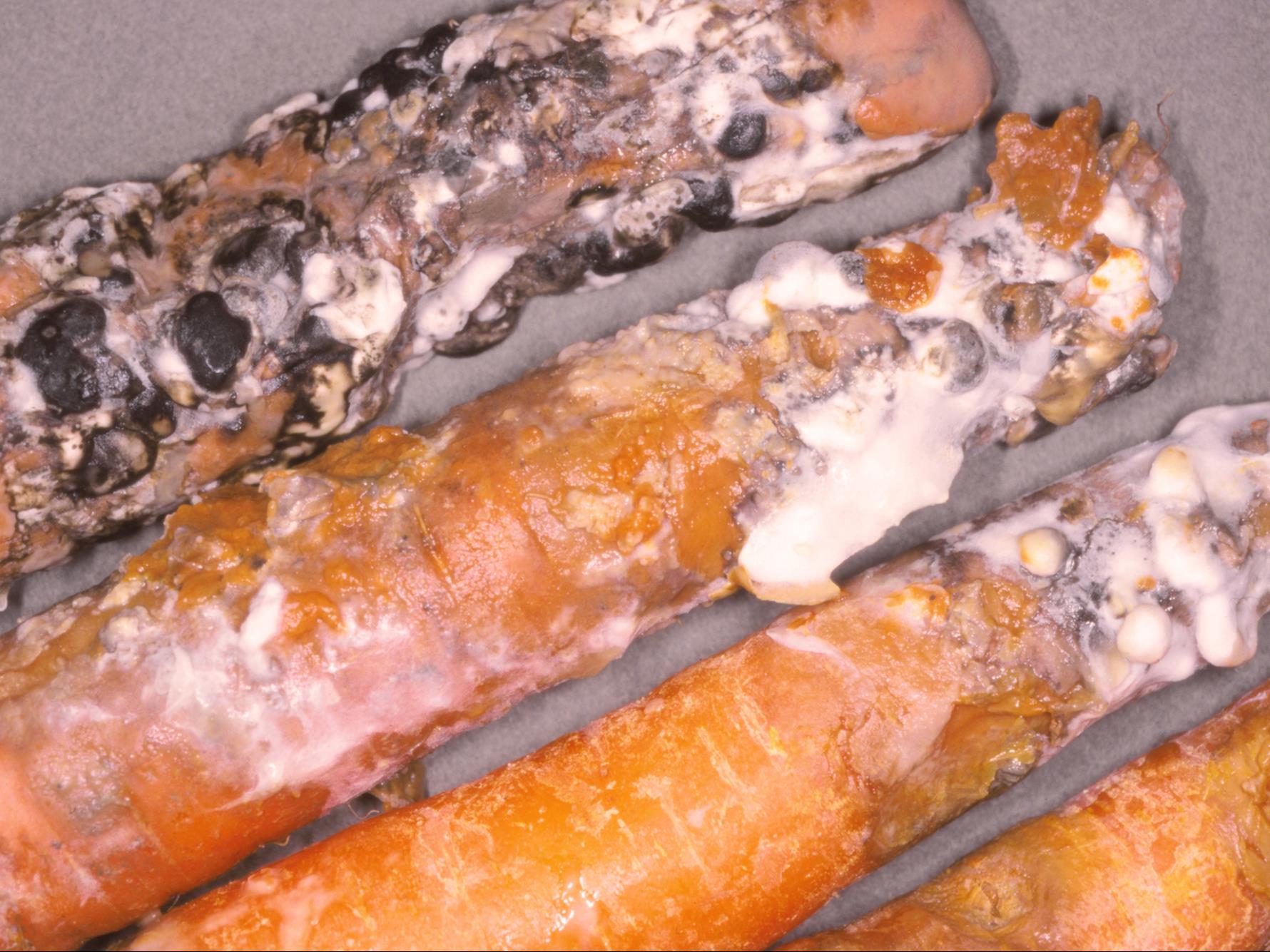 Sur des carottes provenant d’un entrepôt, présence d’une pourriture molle brun grisâtre et aqueuse causant un dépérissement partiel ou total des racines. Les tissus infectés se couvrent d’un mycélium blanc cotonneux et de gros sclérotes noirs. Les tests de laboratoire ont révélé la présence du champignon Sclerotinia sclerotiorum, responsable de la pourriture blanche. Aucune bactérie n’a été détectée des dommages.