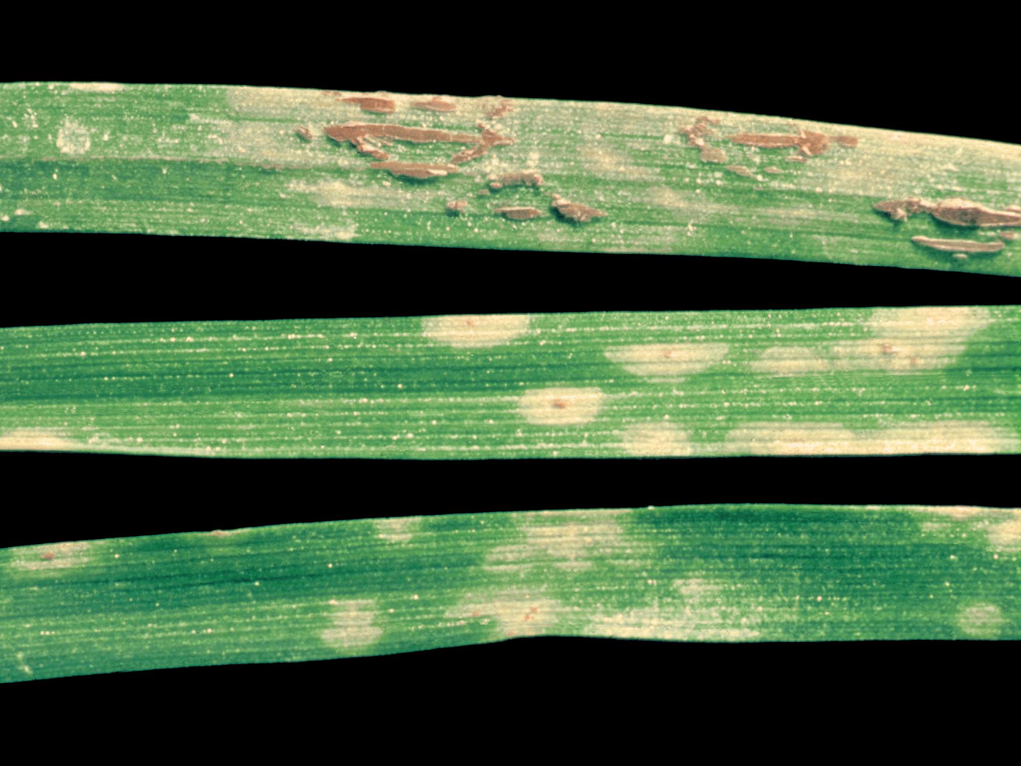 Sur des feuilles d’avoine, présence de taches jaunes à blanches, bien définies ou diffuses, et parallèles aux nervures principales. Sur la feuille du haut, des spores brun rouille du champignon sont observées, mais se font plus discrètes sur la feuille du centre. Les observations microscopiques ont confirmé la présence d’urédospores du champignon Puccinia graminis, responsable de la rouille des tiges (rouille noire) chez l’avoine.