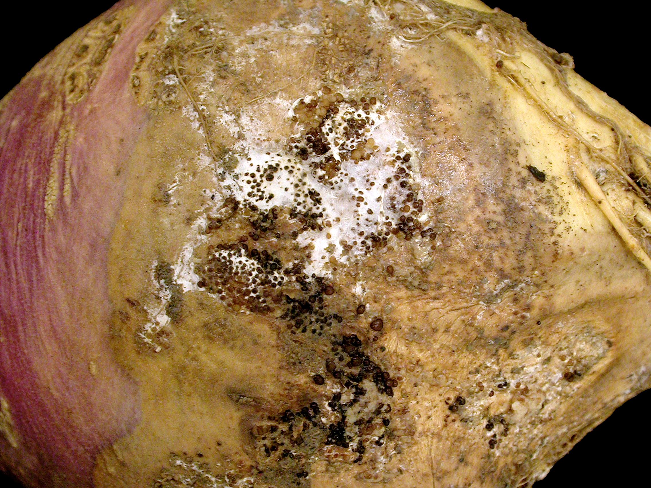 Pourriture molle, mycélium blanc et sclérotes noirs sur rutabaga
