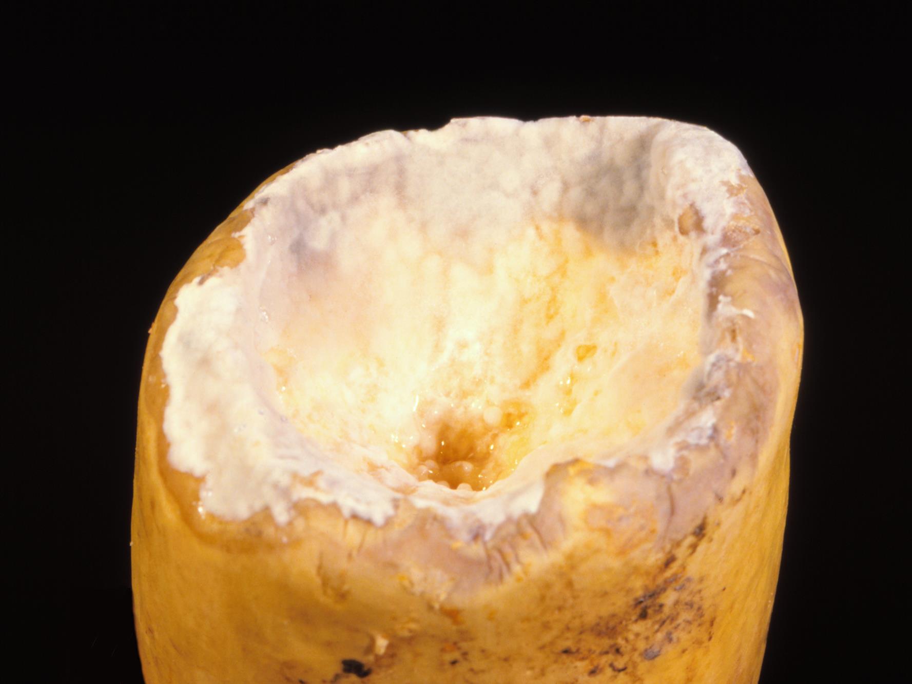 Dans la zone pédonculaire d’une courge musquée 'Butternut' provenant d’un entrepôt, présence d’une importante pourriture aqueuse couverte d’un mycélium blanc grisâtre et inodore. Les tissus pourris se sont affaissés dans la chair et le pédoncule s’est facilement brisé. Les observations microscopiques ont révélé la présence du champignon Botrytis cinerea, responsable de la moisissure grise chez les cucurbitacées.
