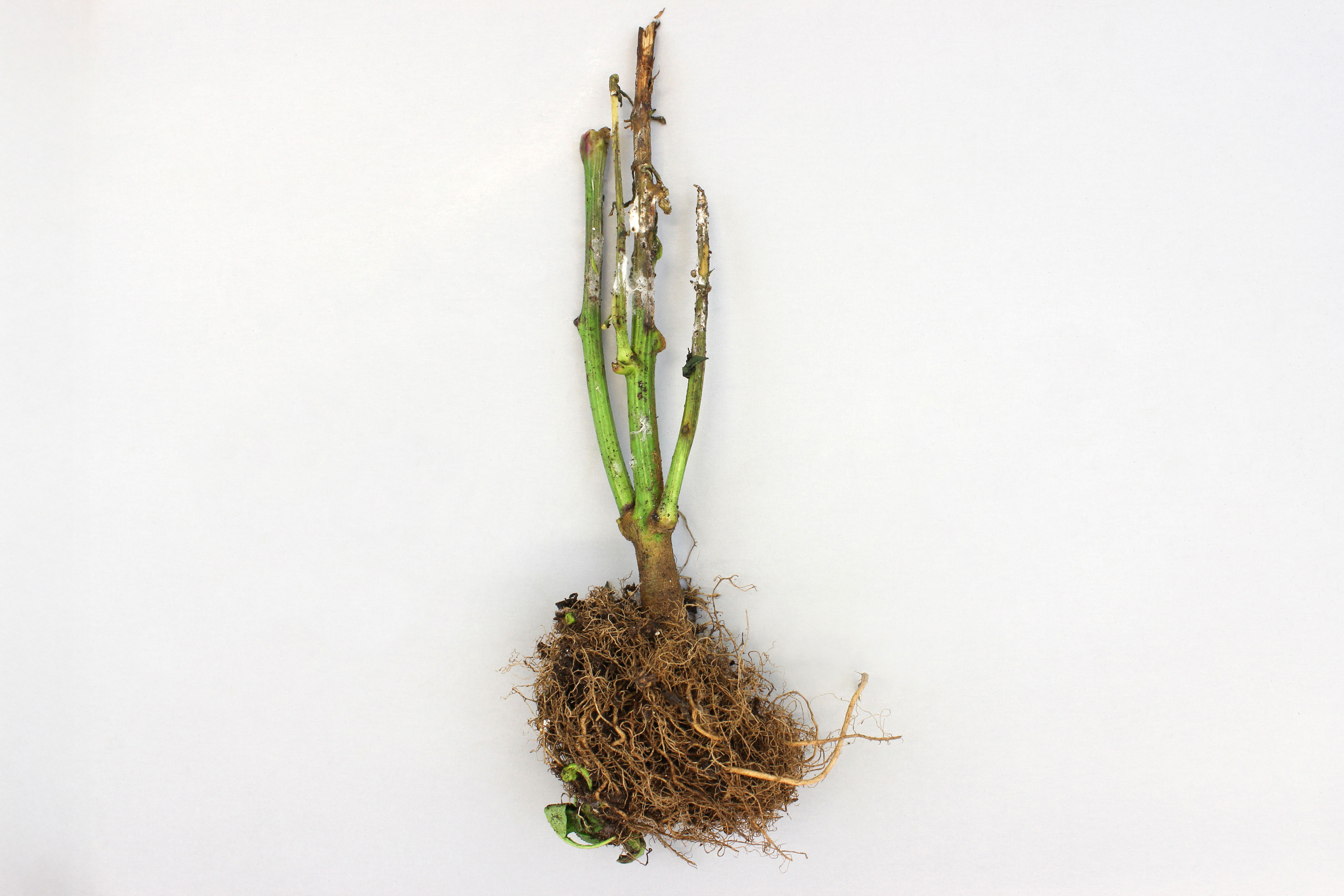Les tiges d’un plant de poivron de champ montrent des zones de pourriture dans lesquelles les tissus sont bruns. Un mycélium blanc est présent dans les zones de pourriture. Le pétiole des feuilles est également affecté. Les tests de laboratoire ont révélé la présence du champignon Sclerotinia sclerotiorum, responsable de la pourriture sclérotique (sclérotiniose).