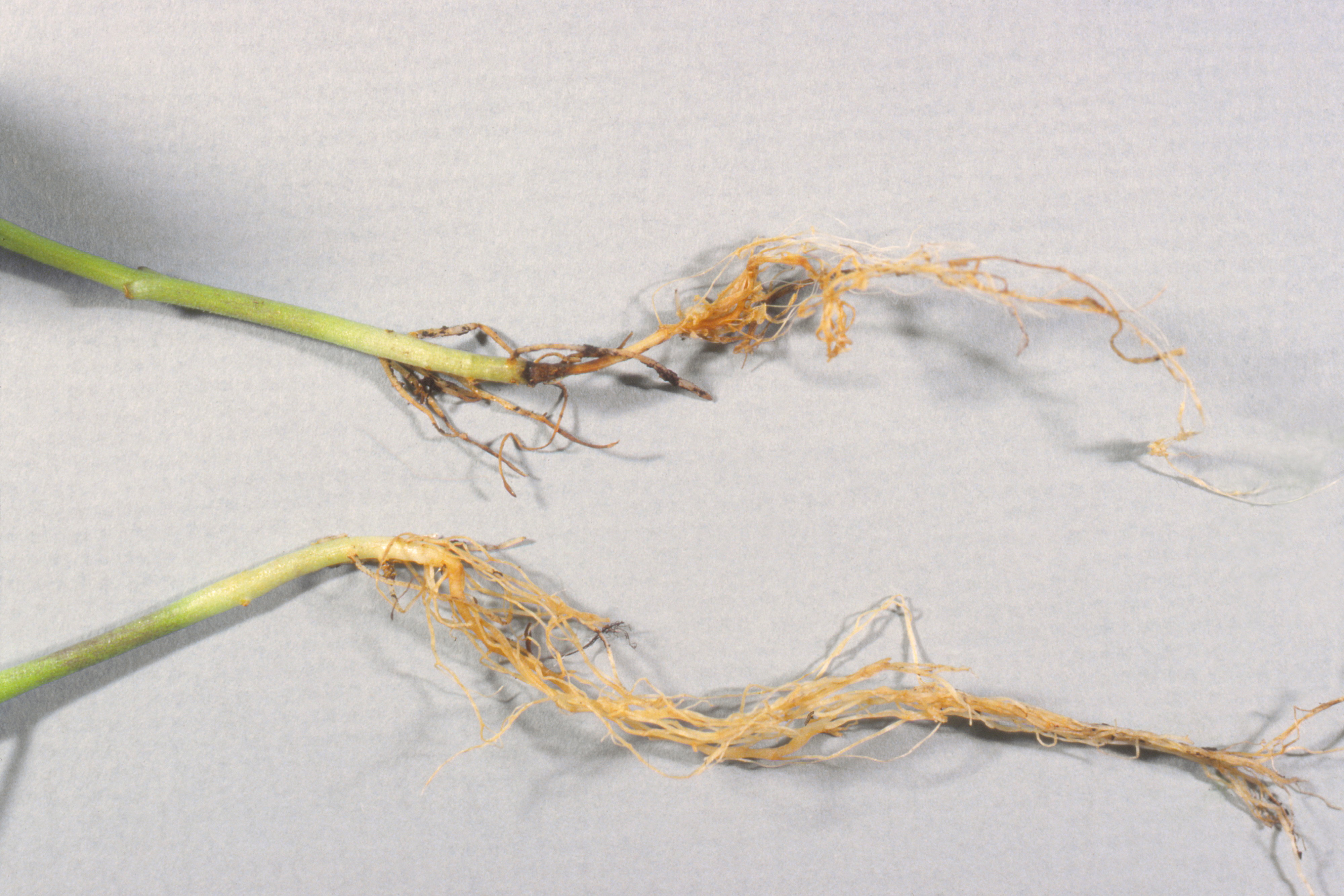 De jeunes plants de poivron de serre montrent une constriction brune au niveau du collet. Les racines sont brun orangé. Les plantules cherchent à s’enraciner au-dessus de la constriction. Les observations microscopiques ont révélé la présence du champignon Rhizoctonia solani, responsable de la fonte des semis chez le poivron.