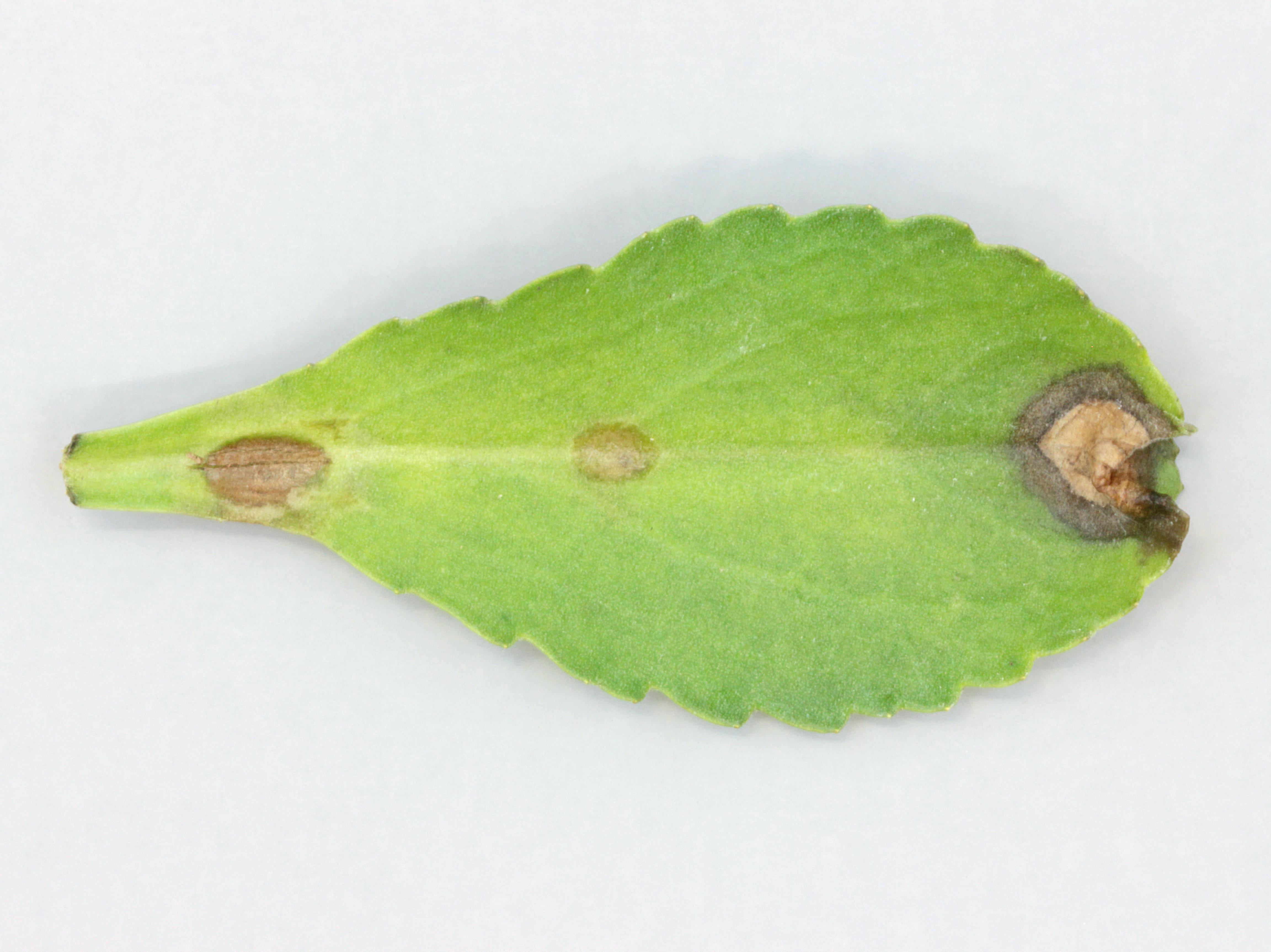 Les feuilles de marguerites vivaces cultivées en serre montrent des taches de différente nature selon leur stade de développement. Les taches semblent débuter par l'apparition d'un halo jaune puis un brunissement apparaît ensuite au centre de ce halo (non visible ici). Certaines taches de plus grandes dimensions sont beiges à brunes, sèches et ne portent pas de halos jaunes. Les taches sont présentes sur les trois niveaux de feuille. Les tests de laboratoire ont révélé la présence du champignon Myrothecium roridum. Ce champignon cause des taches foliaires chez plusieurs plantes ornementales.
