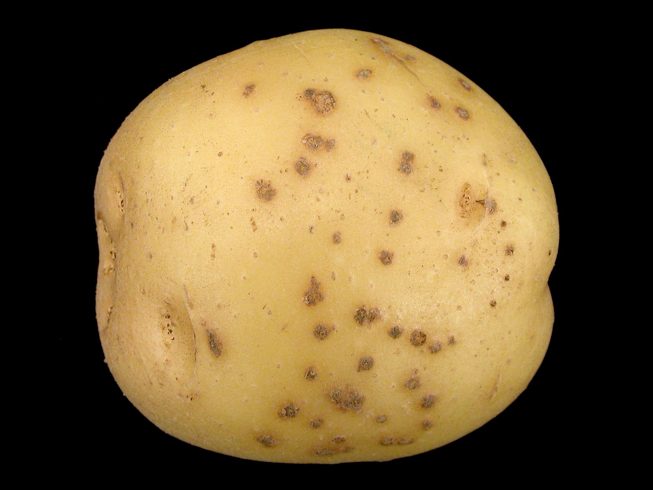 Sur un tubercule de pomme de terre provenant d’un champ, la pelure présente des lésions brunes superficielles, circulaires et légèrement surélevées. Le diamètre moyen des lésions est de quelques millimètres. Les observations microscopiques ont révélé la présence du champignon Spongospora subterranea, responsable de la gale poudreuse chez la pomme de terre. Il s’agit de jeunes lésions de la maladie.