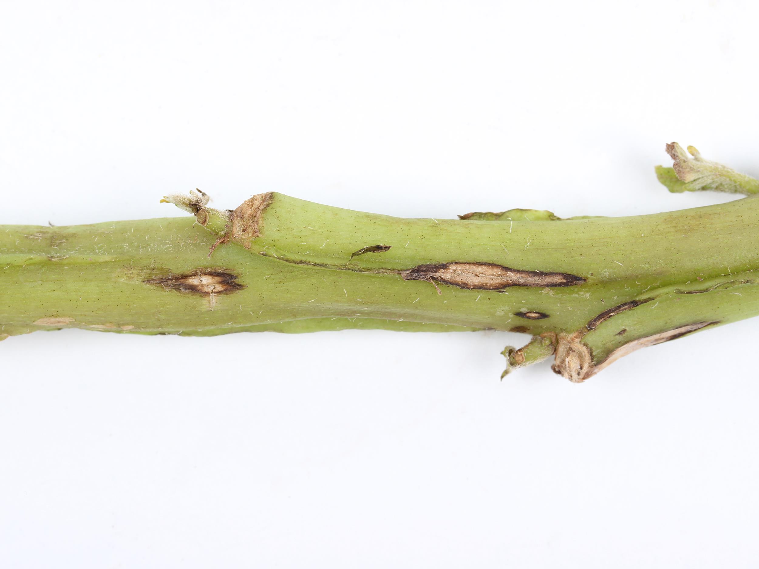 Tous les plants de pommes de terre (cv 'Goldrush') d’un champ présentent des chancres blancs à bruns à la base des tiges, souvent sous les nœuds des feuilles basales. Les feuilles sont également brûlées et dépéries. Les tests de laboratoire ont révélé la présence du champignon Colletotrichum coccodes, responsable de la dartrose chez la pomme de terre.