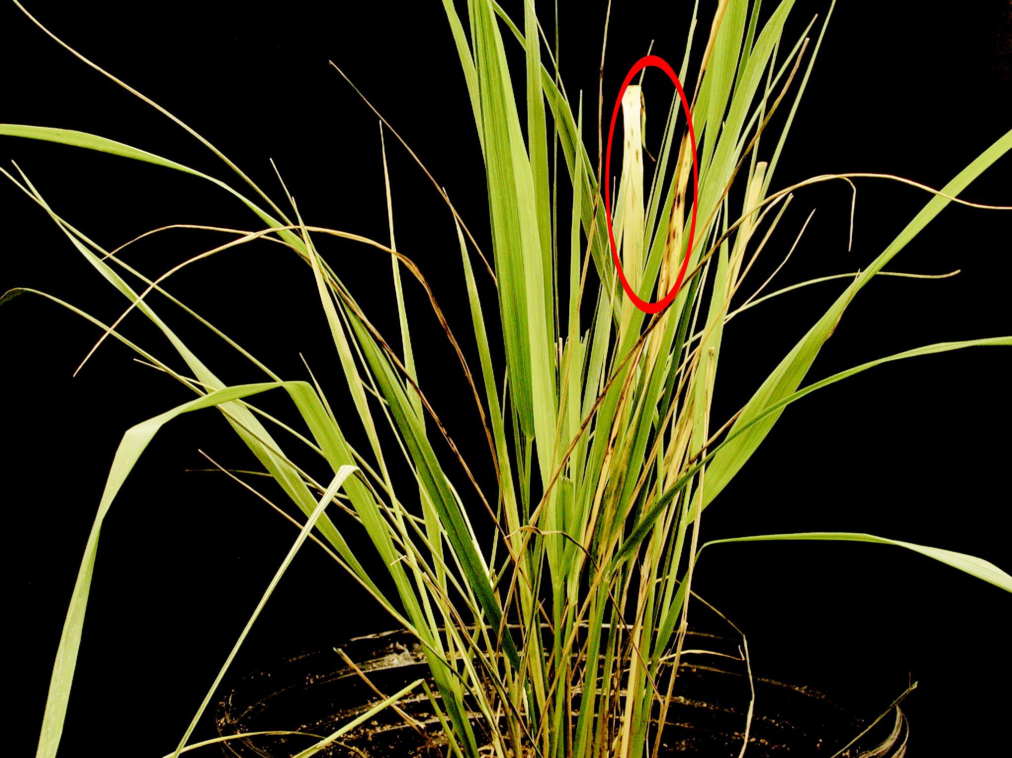 Quelques feuilles basales de calamagrostide (cv 'Karl Forester') montrent des taches allongées, violacées à noires, dont le diamètre varie entre 1 et 10 mm (voir cercle). Les tests de laboratoire ont révélé la présence du champignon Colletotrichum sp., responsable de l’anthracnose. Deux espèces de Colletotrichum sont rapportées chez la calamagrostide hybride soient C. gloeosporioides et C. graminicola.