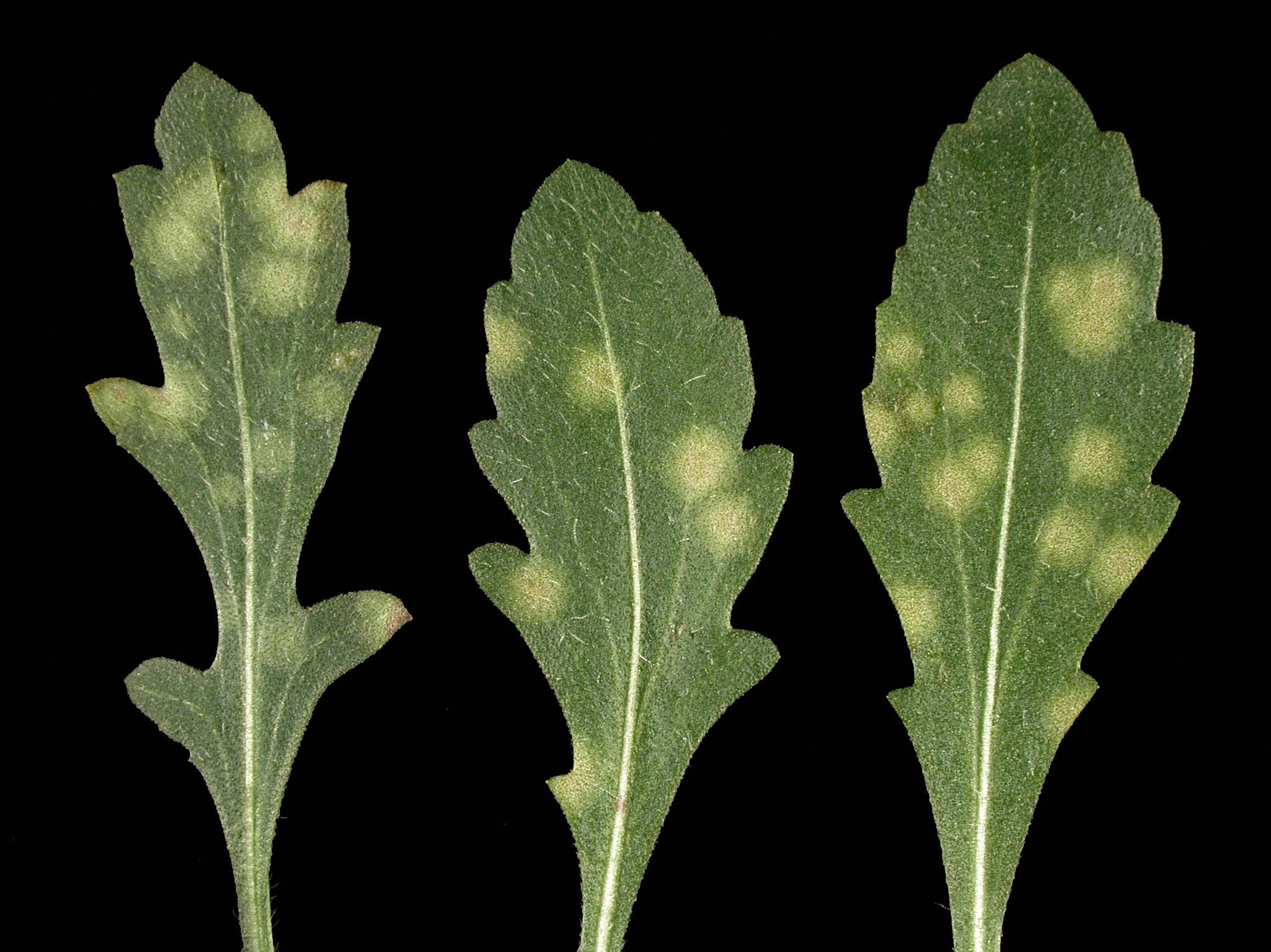 Les feuilles d'une gaillarde hybride (cv 'Bijou') cultivée en serre montrent des taches circulaires blanches, d’un diamètre moyen de 5 mm. La maladie est plus sévère sur les vieilles feuilles. Les observations microscopiques ont révélé la présence du champignon Entyloma sp., responsable du charbon foliaire.