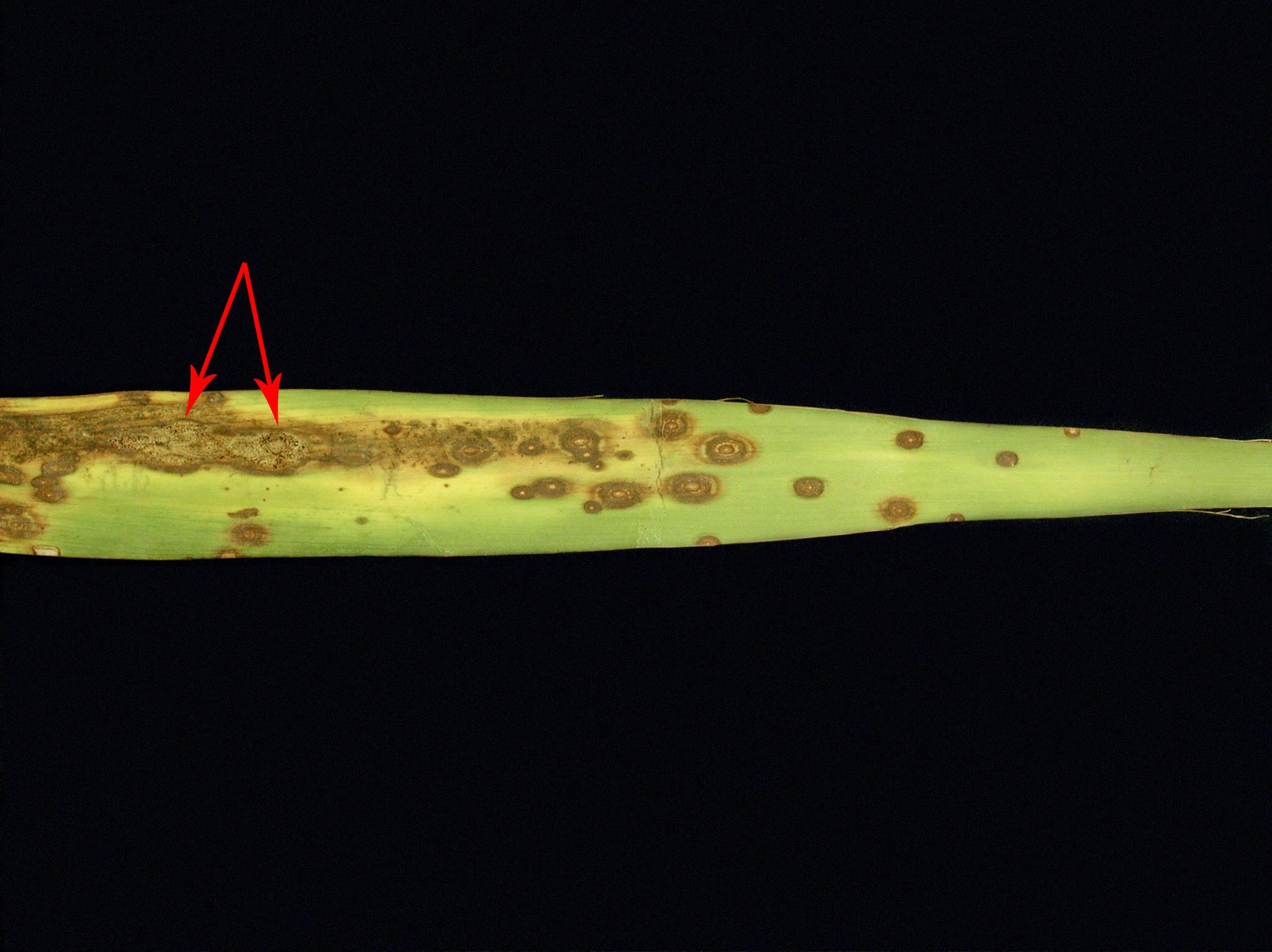 Une feuille de yucca montre de nombreuses taches concentriques à ovales, brunes avec une large marge brun foncé. Les taches se regroupent pour former de larges plages brunes, d'aspect brûlé. Un halo jaune entoure les plages. Il y a présence de fructifications fongiques au centre des taches (voir flèches). Les observations microscopiques ont révélé la présence du champignon Microsphaeropsis concentrica, responsable de la tache zonée chez le yucca.