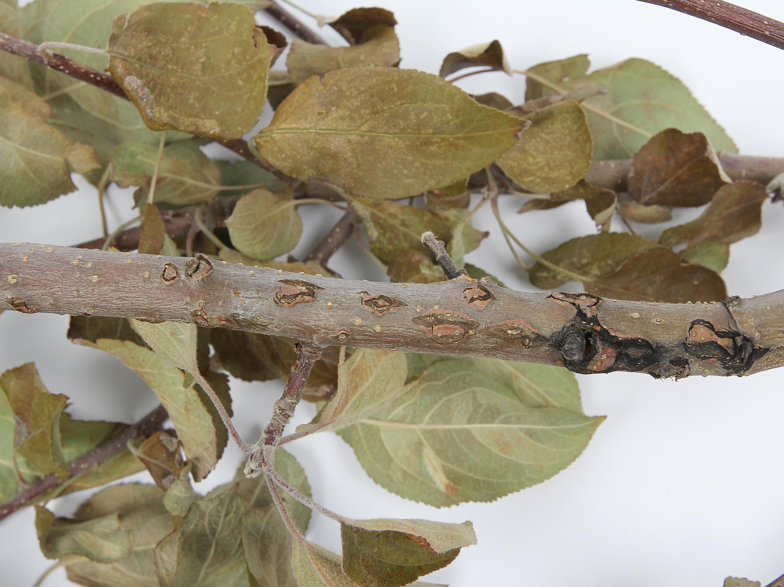 Sur un jeune pommier implanté depuis deux années (cv 'SnowSweet' sur M106), le greffon montre de petits chancres déprimés au pourtour crevassé. La taille des chancres est variable. Le porte-greffe n’est pas affecté. Les tests de laboratoire ont révélé la présence du champignon Cylindrocarpon sp. Considérant le résultat des tests et les symptômes, il est plausible de croire qu’il s’agit de C. heteronema, responsable du chancre nectrien (chancre européen) chez le pommier. Le producteur mentionne que les arbres ont commencé à montrer des symptômes de dépérissement le printemps de la deuxième année après la plantation.