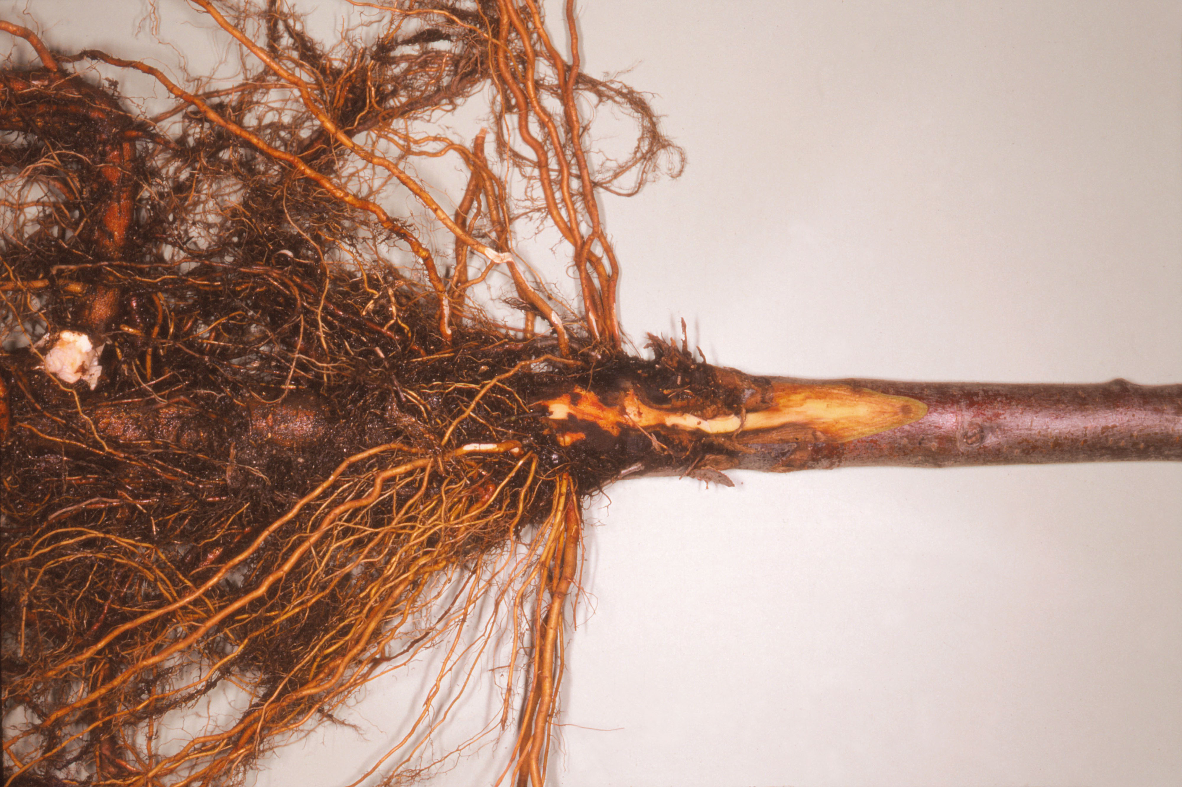 La base d’un jeune pommier (cv 'Paulared') montre un brunissement de l’écorce au niveau du collet et du pivot racinaire. Les tissus sous-jacents sont bruns. Au collet, on aperçoit une démarcation entre les tissus sains et affectés. Les radicelles sont brunes. Les tests de laboratoire ont révélé la présence de Phytophthora cactorum, responsable de la pourriture des racines et du collet.