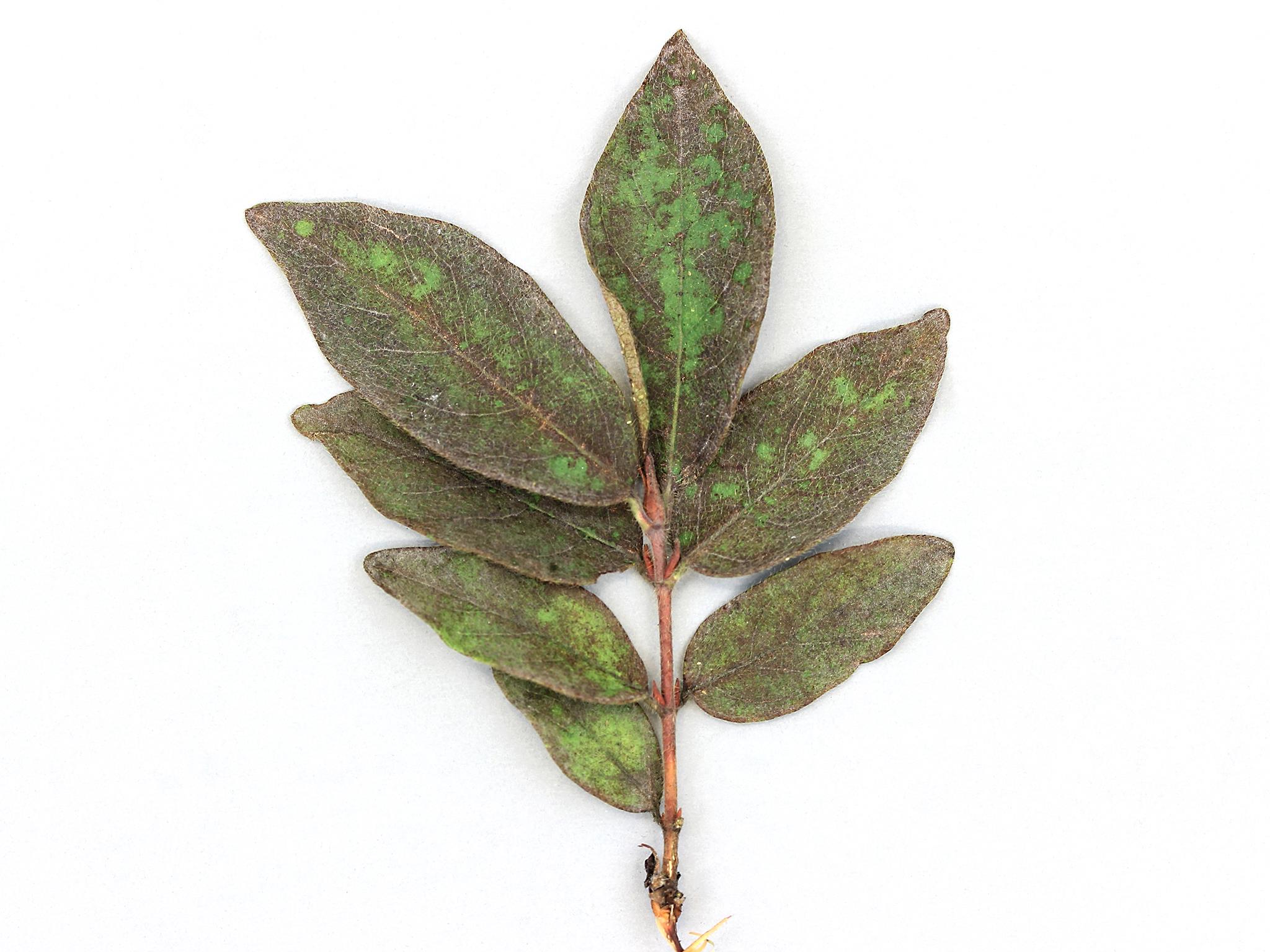 Cet échantillon de feuilles de camérisier infectées par le blanc a été reçu au laboratoire un 30 juillet. Le mycélium blanc et poudreux du champignon a probablement été balayé à la suite d'une pluie, laissant apparaître des brunissures intenses sur le limbe. Les conidies de Erysiphe lonicerae ont tout de même pu être observées sur les feuilles.
