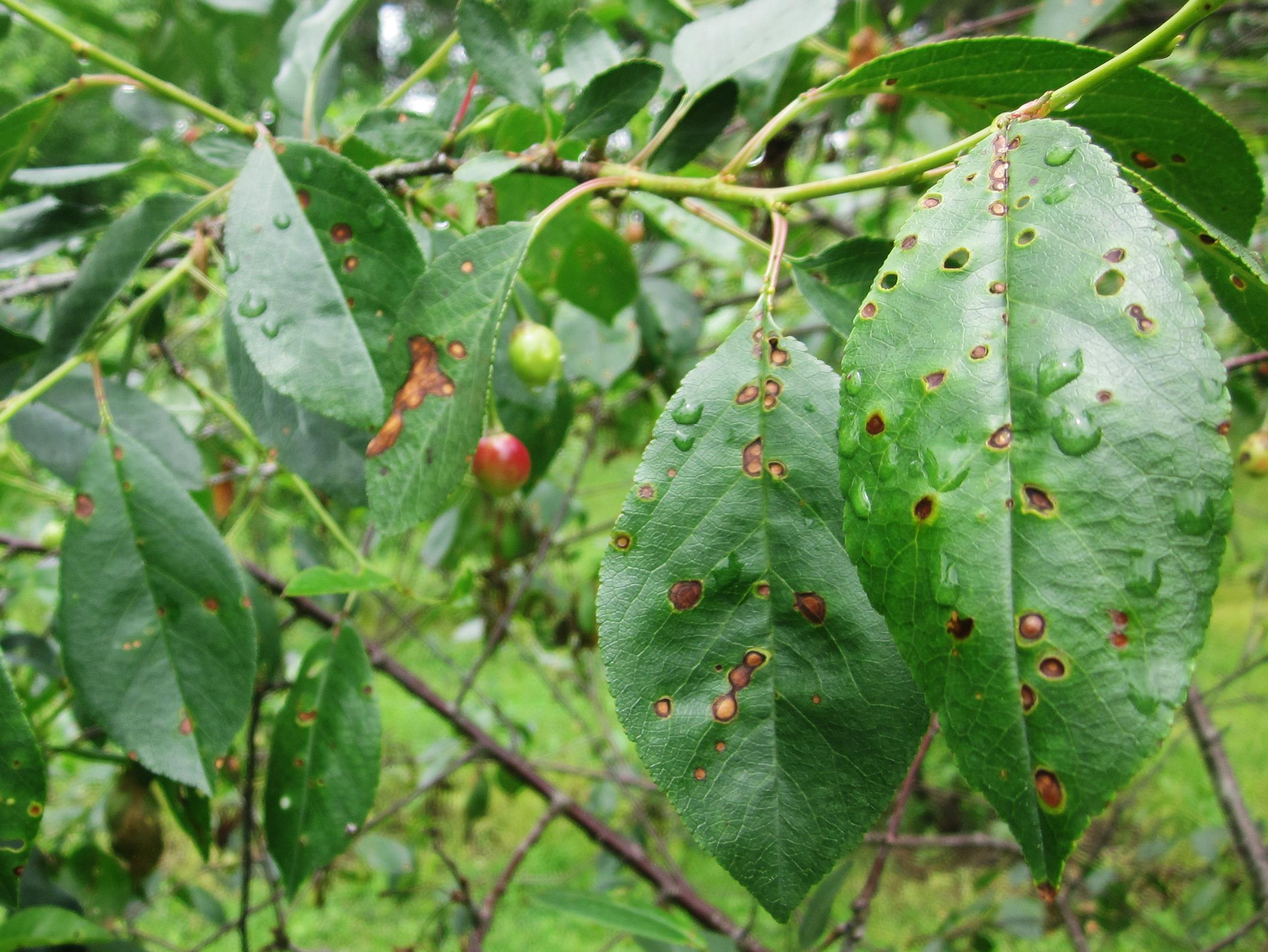 Feuilles de cerisier nain rustique infectées par la brûlure corynéenne (ou criblure) causée par Wilsonomyces carpophilus.