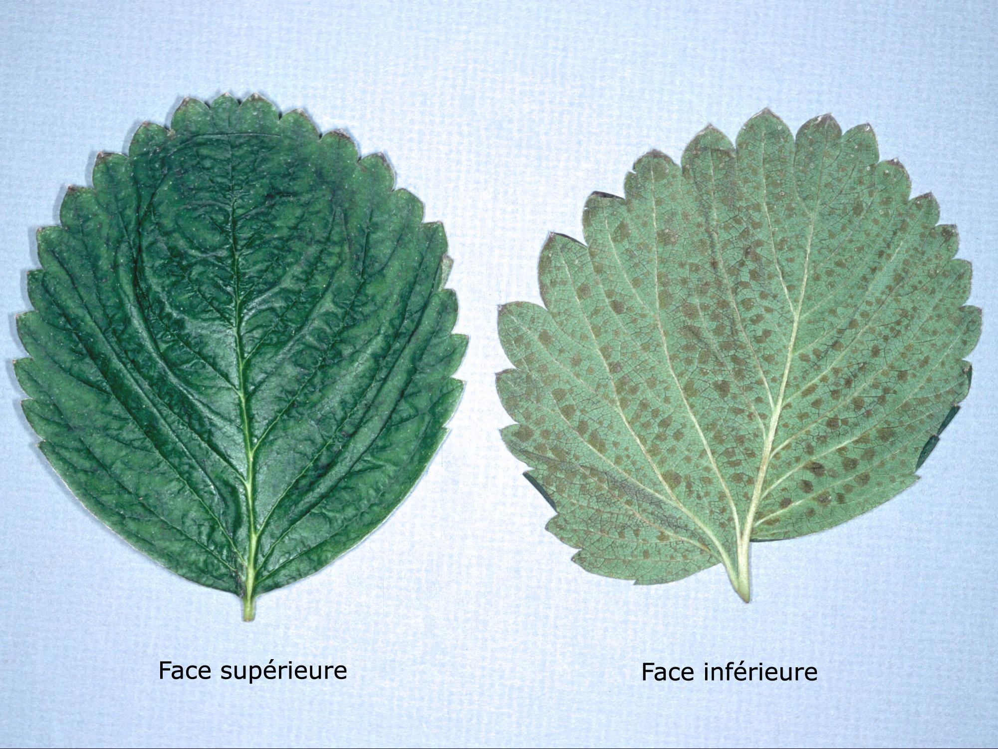 Sur des folioles de fraisiers cultivés en serre, présence de nombreuses taches circulaires brunâtres ayant un diamètre variant entre 1 et 5 mm. Elles sont présentes uniquement à la face inférieure et réparties sur l'ensemble du limbe. Comme les taches sont circulaires et que la répartition des taches est uniforme ou symétrique sur le limbe, il est vraisemblable de croire que le problème a une origine non parasitaire. Une phytotoxicité à la suite d'une utilisation d'huile de dormance semble la cause la plus probable. Cette huile minérale n’est pas homologuée dans la culture de la fraise.