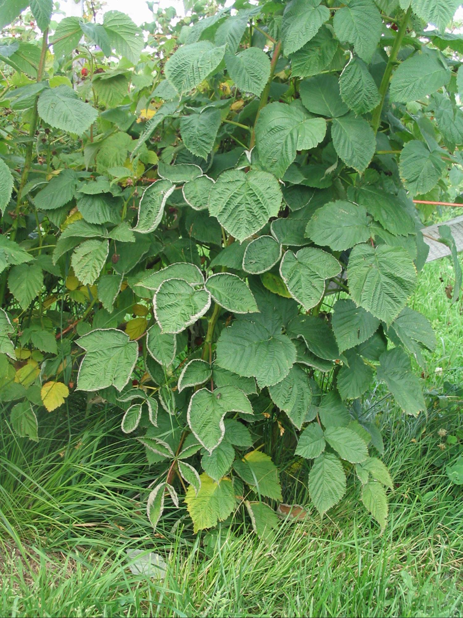 Une vue rapprochée montre l’enroulement en forme de cuillère de la marge des feuilles basales de framboisier. Ce symptôme est causé par l’herbicide clopyralide (LONTREL 360). Le LONTREL 360 a été appliqué localement, à la mi-juillet, pour lutter contre la vesce jargeau dans la framboisière et il y a eu contact de l’herbicide avec les feuilles de framboisier.