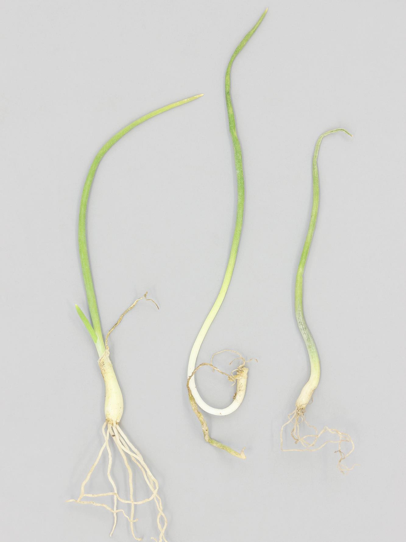 Les plantules d'oignon sec provenant d’un champ présentent de sévères malformations au niveau des feuilles et du collet. Les feuilles sont enroulées en spirale ou en forme de crochet. Quant à lui, le collet est soit gonflé ou recourbé. La taille des plants est également réduite. Les dommages observés sont attribuables à une phytotoxicité par l’herbicide FRONTIER MAX (diméthénamide-P) appliqué trop tôt en saison (en préémergence). Au champ, plus de 75 % des plants sont affectés.