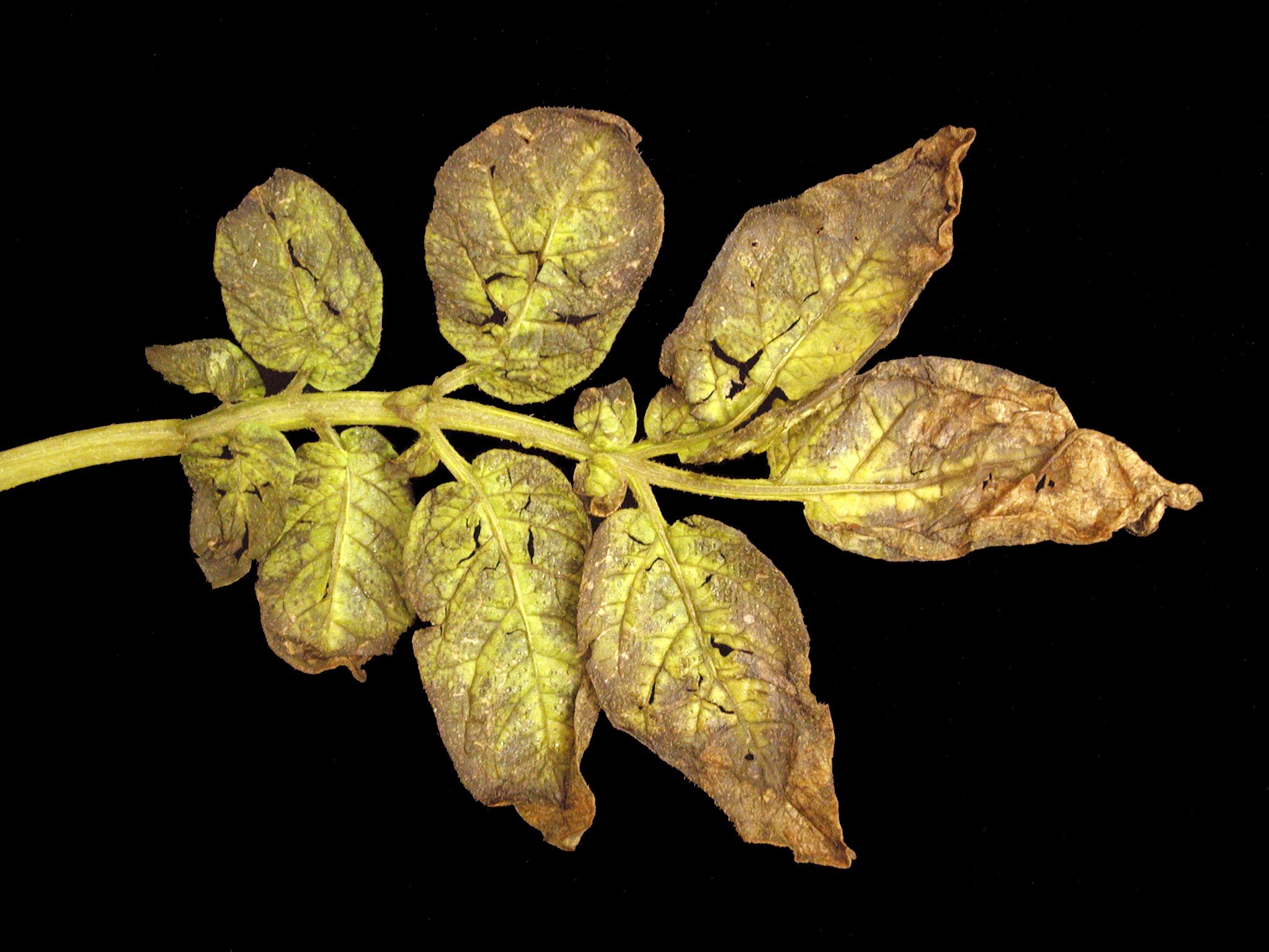 Une feuille basale de pomme de terre (cv 'Envol') montre des folioles complètement jaunes avec une brûlure de la marge qui débutait par l’apex. Les feuilles moins affectées montraient des nervures jaunes. Les jeunes feuilles étaient saines. Les dommages sont caractéristiques d’une phytotoxicité à la métribuzine (SENCOR) et le cultivar 'Envol' serait particulièrement sensible.