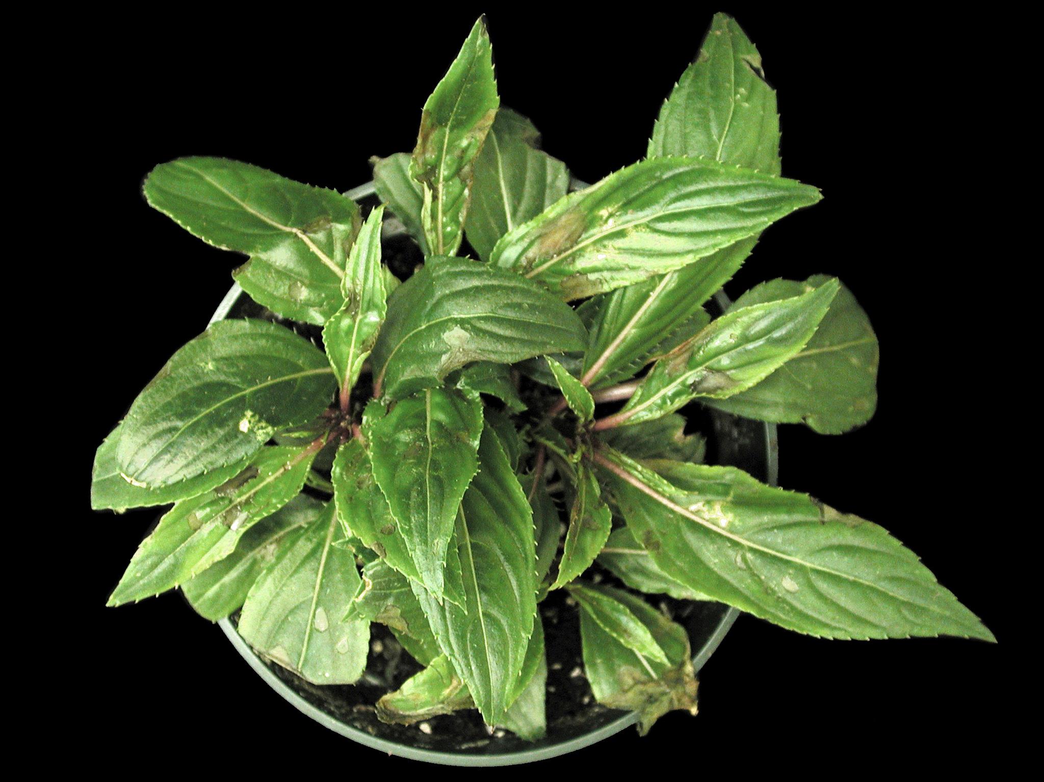 Les feuilles d’une impatiente de Nouvelle-Guinée montrent des brûlures irrégulières beiges à vert tan, souvent localisées entre les nervures secondaires des feuilles médianes et terminales. Les brûlures provoquent des malformations foliaires. Les tests de laboratoire se sont avérés négatifs pour la détection d’agents pathogènes.