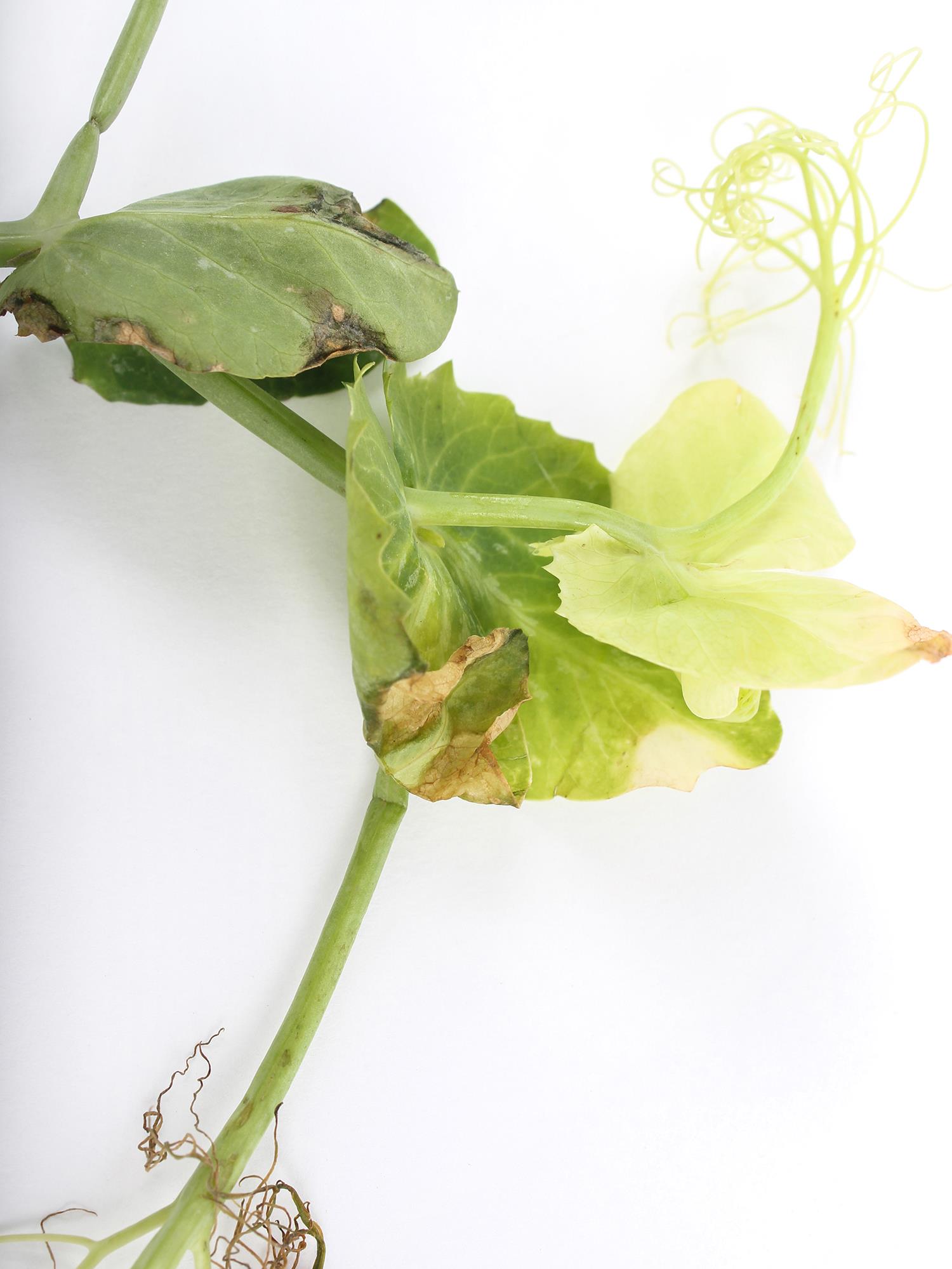 Une vue rapprochée de la partie terminale d’un plant de pois vert montre un jaunissement à blanchiment du limbe des jeunes feuilles et des vrilles. La marge des feuilles affectées est parfois brûlée. L'analyse chimique réalisée par le Laboratoire d'expertises et d'analyses alimentaires (LEAA) du MAPAQ a révélé la présence d'atrazine et de son métabolite de décomposition (de déséthylatrazine) en quantité suffisante pour provoquer le jaunissement observé. Une très faible quantité de mésotrione a aussi été trouvée. Il est également possible qu'une partie des décolorations lui soit attribuable. Le précédent cultural était le maïs grain et fourrager.