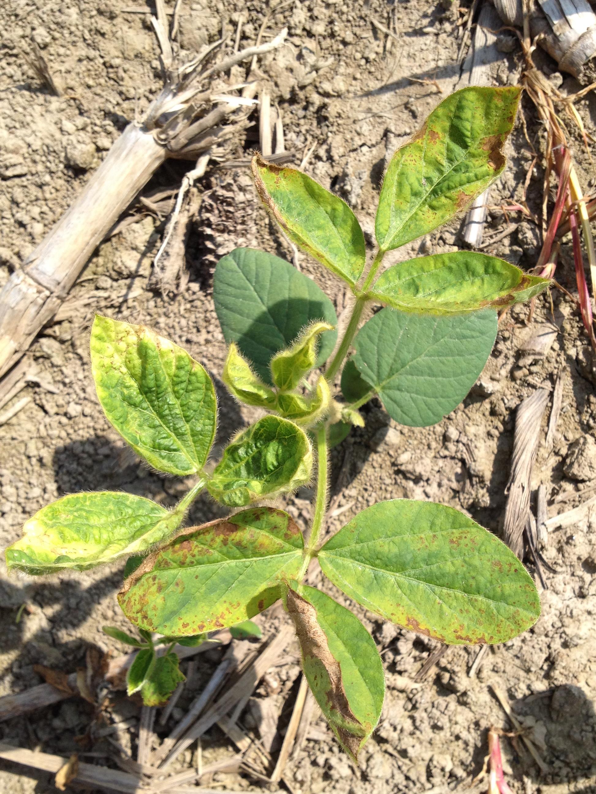 Présence d’un jaunissement à blanchiment internervaire sur des feuilles de soya. Ce symptôme est attribuable aux résidus de mésotrione dans le réservoir du pulvérisateur, suivant une application de l’herbicide HALEX (glyphosate; S-métolachlore; mésorione) et d’atrazine, dans un champ de maïs. Typiquement, les plantes sensibles à la mésotrione présentent un blanchiment (ou un jaunissement) internervaire, suivi d’une nécrose des tissus. L’application de mésotrione dans une culture de soya peut occasionner d’importants dommages, des pertes de rendement voire la mort de la culture. Les résidus d’atrazine pourraient aussi avoir provoqué les symptômes de brûlure, présents sur les feuilles de soya.