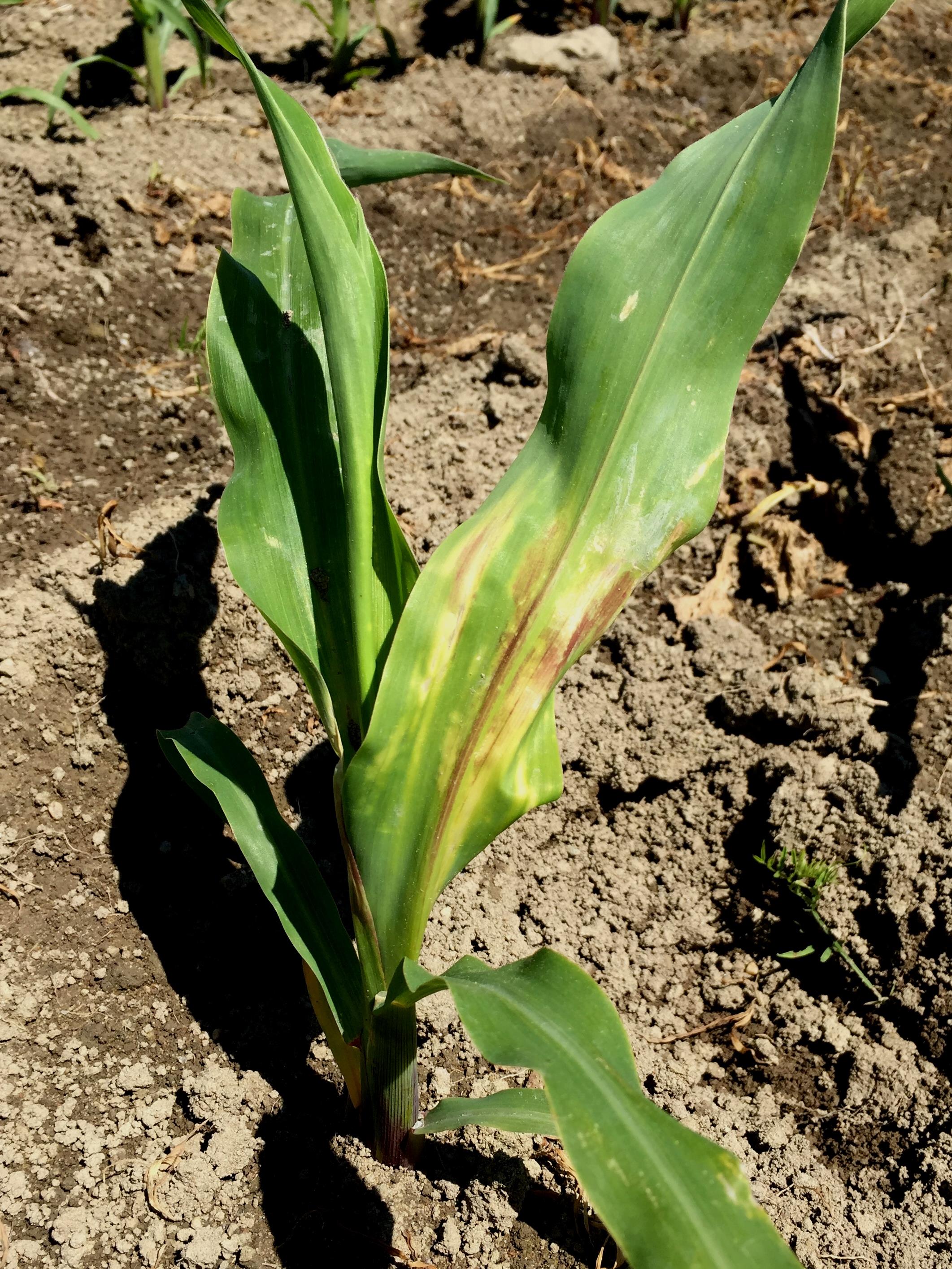 La feuille médiane d’un plant de maïs montre un jaunissement et une coloration pourpre des tissus. Ce symptôme est le résultat d’une application par erreur de FREESTYLE, un mélange commercial contenant deux herbicides du groupe 2 : le chlorimuron-éthyle et l’imazéthapyr. Ce mélange d'herbicides est homologué dans la culture du soya et des légumineuses mais pas dans celle du maïs. Les symptômes typiques de phytotoxicité (coloration pourpre à violet, blanchiment à jaunissement, atrophie du système racinaire, enroulement des feuilles du cornet, etc.) peuvent n’apparaître qu’une à trois semaines suivant l’application, selon les conditions de croissance et la vulnérabilité des espèces présentes. Le maïs est très sensible à la famille des imidazolinones dont l’imazéthapyr fait partie. La dose du mélange appliqué est inconnue.