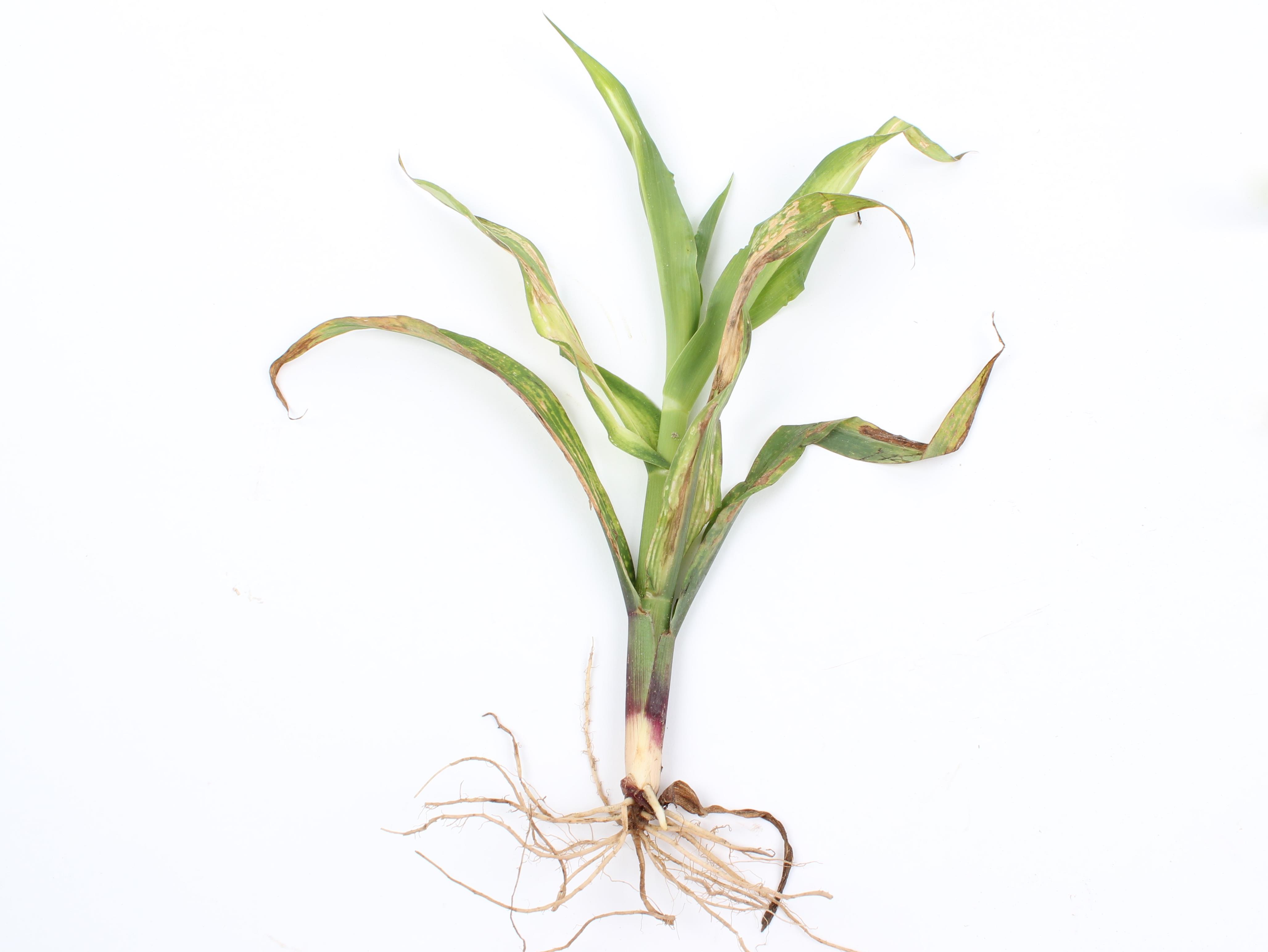Feuilles de maïs avec blanchiment internervaire et brûlures