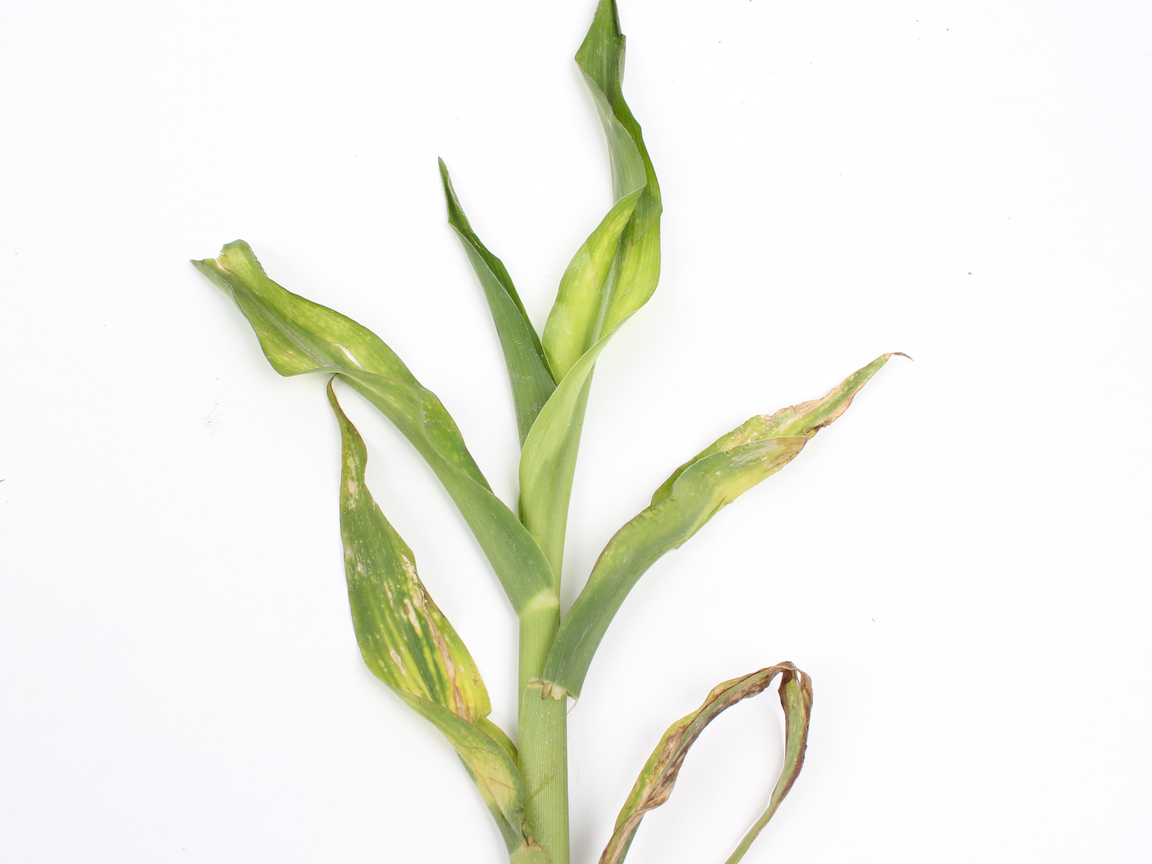 Feuilles de maïs avec blanchiment internervaire et brûlures
