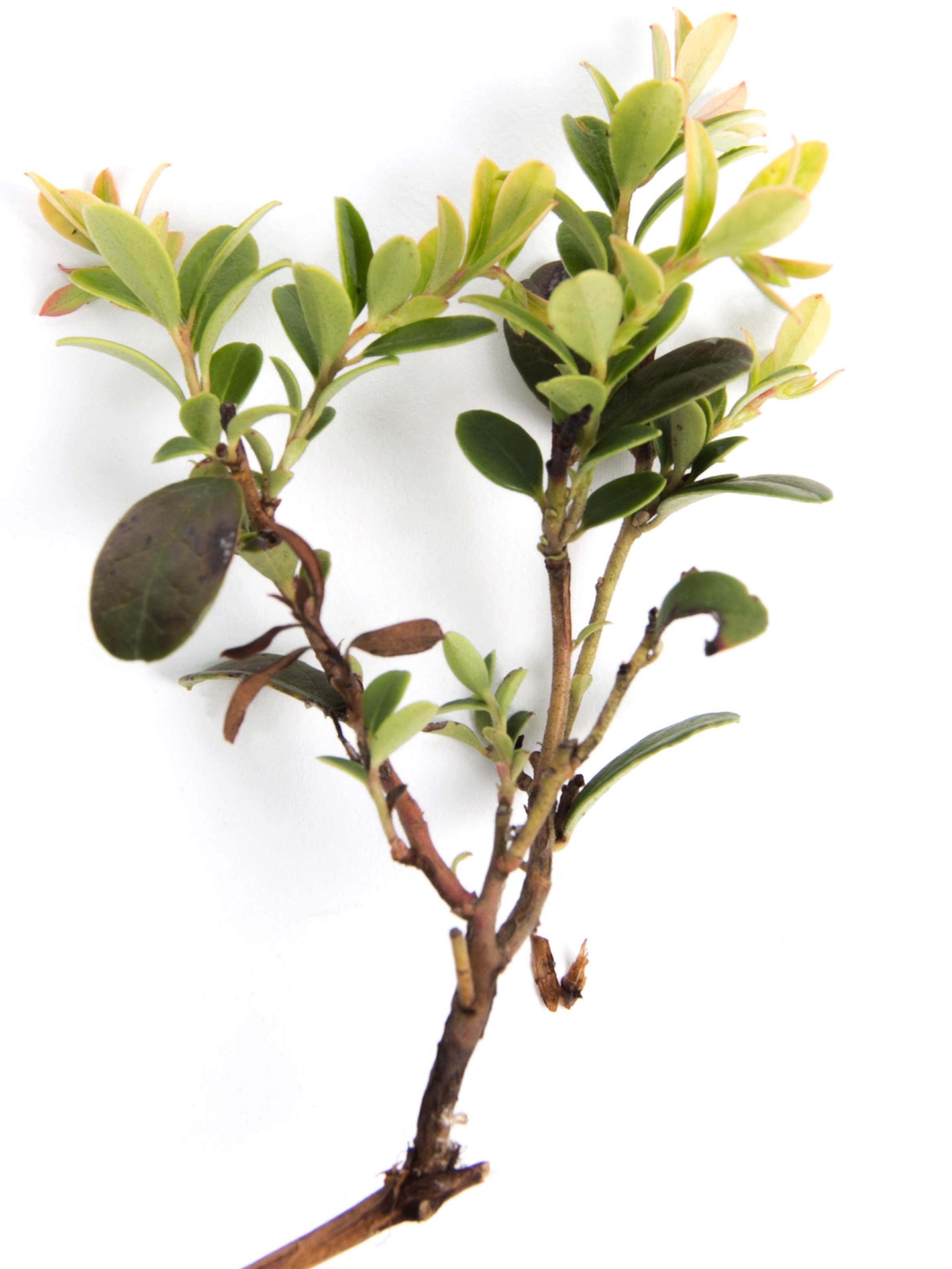 Plusieurs feuilles terminales d'un plant d’airelle rouge présentent un jaunissement et/ou une coloration rosée des tissus. Une brûlure des tiges secondaire est aussi observable. Ces symptômes sont attribuables à une dérive de glyphosate. Les plus jeunes feuilles sont les premières à être affectées. Les symptômes apparaissent dans un délai de 10 à 14 jours, suivant l'application. Le dosage chimique a révélé la présence de résidus de glyphosate dans la plante à une concentration faible mais suffisante pour provoquer les symptômes observés.