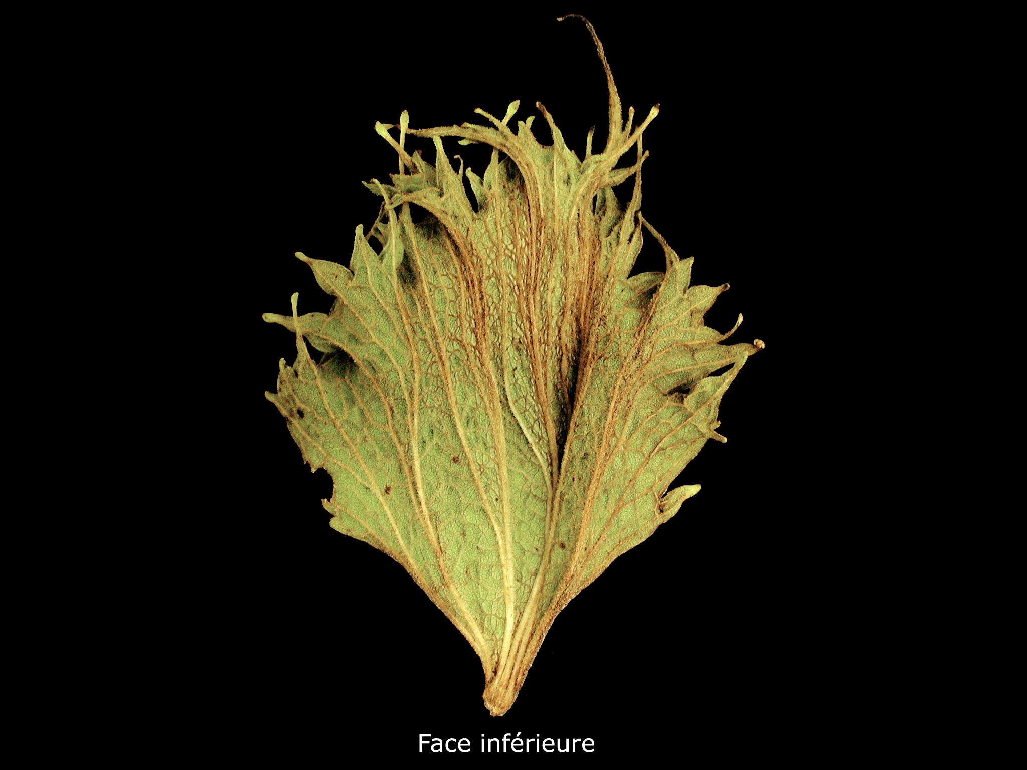 La face inférieure d’une feuille de vigne (cv 'Eona') montre une marge très découpée en forme de dents allongées avec des excroissances filiformes et des nervures saillantes et parallèles. Les jeunes feuilles sont les plus affectées. Ces malformations sont typiques d'une phytotoxicité par des herbicides du groupe 4 (phytohormones ou auxines). Malheureusement, l’herbicide responsable des dommages n’a pu être précisé.