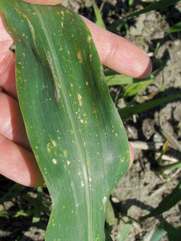 Les feuilles médianes du maïs présentent de petites taches circulaires, réparties sur le limbe à partir de l’apex. Ce symptôme serait attribuable à l’adjuvant présent dans l’herbicide Accent total (nicosulfuron / dicamba et diflufenzopyr), appliqué dans la parcelle de maïs. Ce symptôme survient en particulier lors de conditions de températures élevées, suite à l’application de l’herbicide.