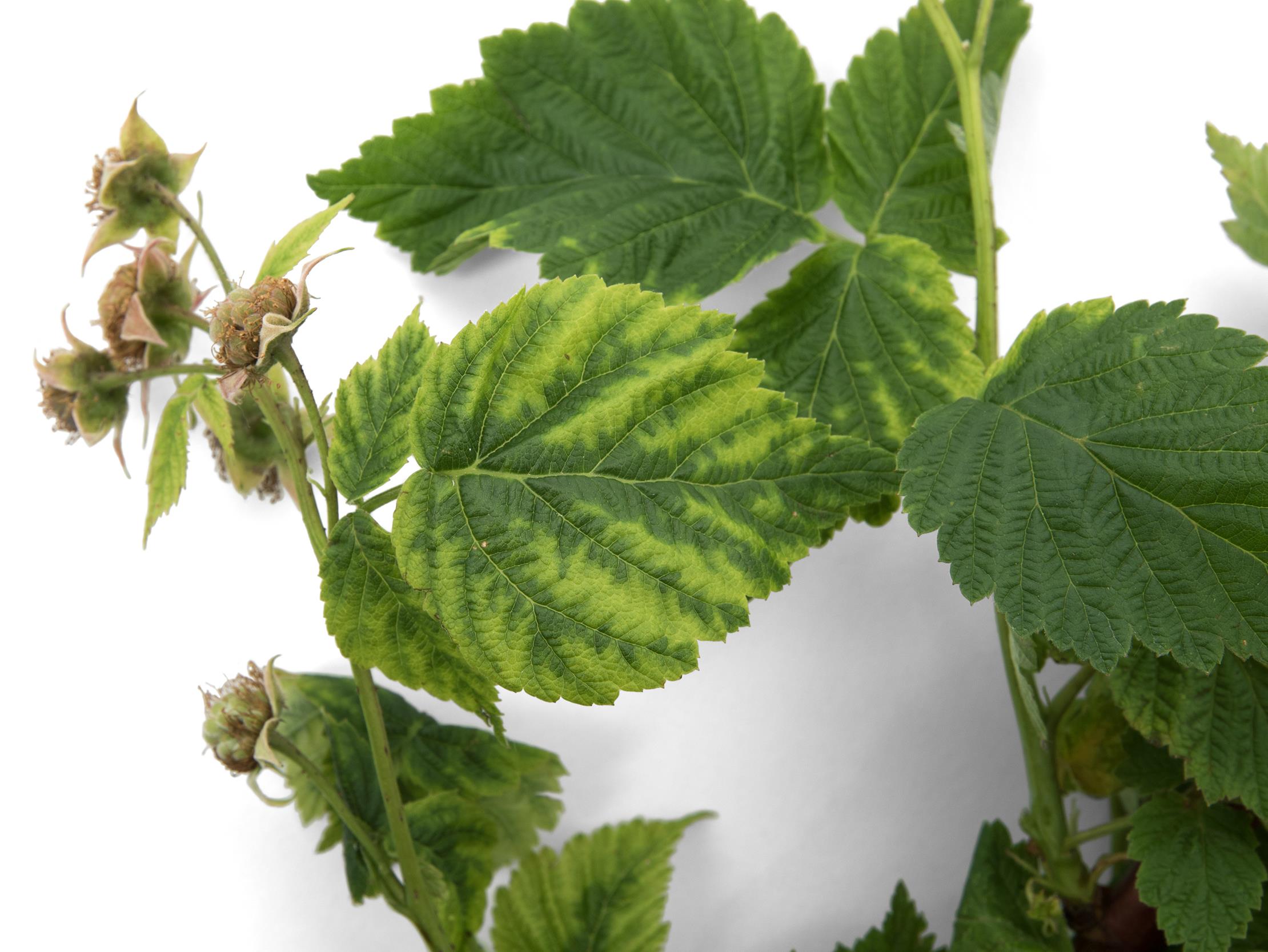 Ces feuilles de framboisier (cv 'Nova') présentent des marbrures jaunes ou vert pâle entre les nervures. Les tests en laboratoire ont détecté la présence du virus de la tache annulaire de la tomate (ToRSV) chez ce framboisier.