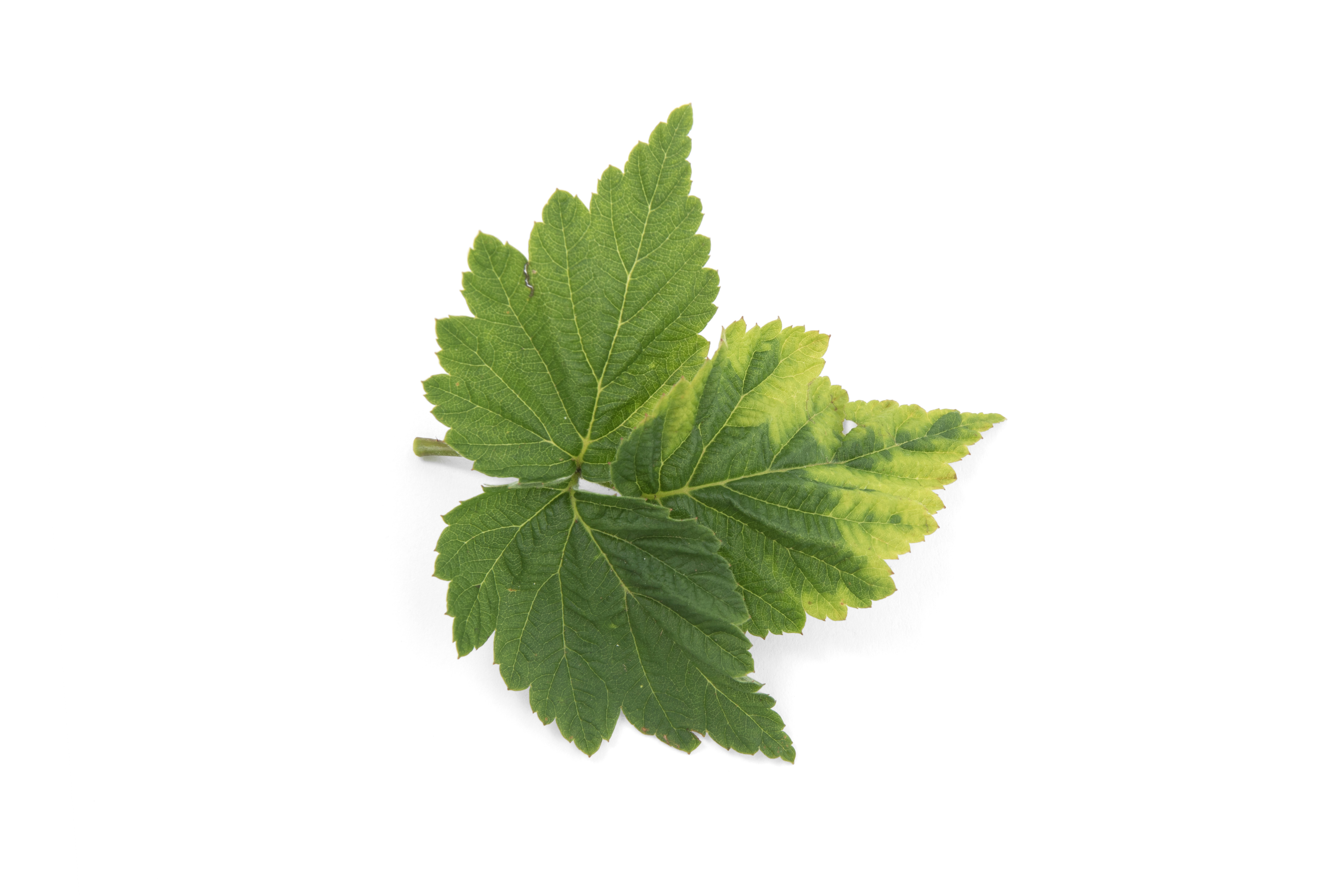 Cette feuille de framboisier (cv 'Nova') présente des marbrures jaunes ou vert pâle entre les nervures. Les tests en laboratoire ont détecté la présence du virus de la tache annulaire de la tomate (ToRSV) chez ce framboisier.
