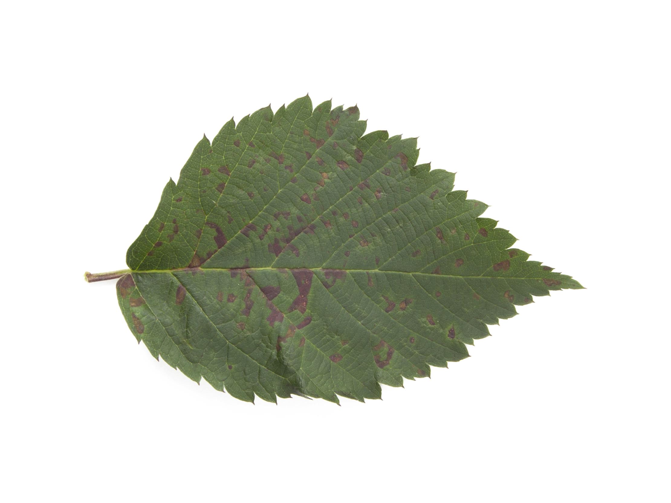 Sur une feuille de mûrier, taches brunes à pourpres de forme angulaire, généralement délimitées par les nervures secondaires des folioles. Les observations microscopiques ont permis d’identifier le champignon Peronospora sp. Il s’agit probablement de Peronospora sparsa, responsable du mildiou chez le mûrier.
